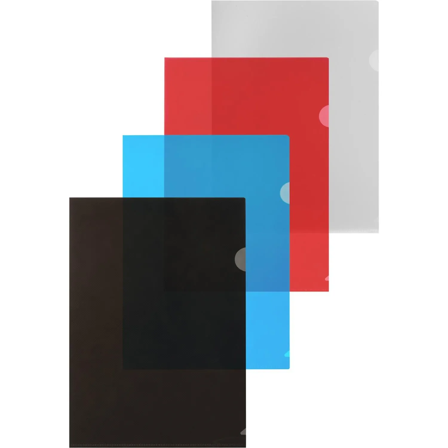 Папка-уголок формата А4 изготовлена из полипропилена. Толщина плёнки — 100 мкм. Папка вмещает до 40 листов стандартной плотности. В упаковке 100 штук.