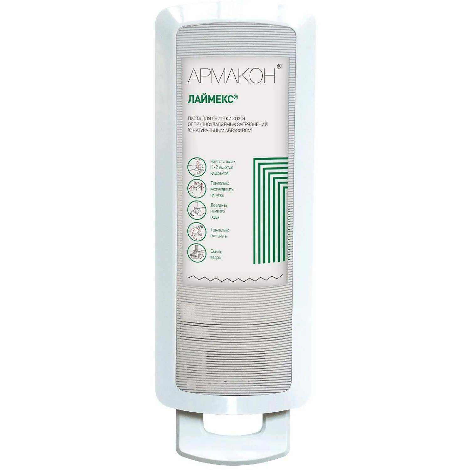 Очищающая паста «Армакон Лаймекс» — паста для очистки кожи от трудноудаляемых загрязнений (с натуральным абразивом). Предназначена для очищения кожи от нефтепродуктов, масел, металлической пыли, графита, смазочных веществ, масляных красок, битума, сажи и так далее. Обеспечивает бережное и эффективное очищение кожи благодаря сбалансированной комбинации ПАВ и натурального абразива. В качестве абразива используется мука из измельченной скорлупы грецкого ореха, изготовленный с использованием современной вакуумной технологии, исключающей образование острых частиц. Входящие в состав пасты алюмосиликат магния и ксантановая камедь эффективно адсорбируют трудносмываемые загрязнения и облегчают их удаление. Паста содержит инактиваторы, нейтрализующие вредное воздействие солей тяжелых металлов и химических раздражителей. Ухаживающий комплекс из растительного масла, олеиновой кислоты и касторового масла эффективно смягчают и увлажняют кожу. Удаляет неприятные запахи с кожи, легко и без остатка смывается водой. Подходит для частого применения. Состав соответствует требованиям регламента ЕС № 1223/2009 от 30 ноября 2009 г. Не содержит растворителей, красителей, силиконов и парабенов. Упаковка: 1000 мл. Условия хранения: избегать попадания прямых солнечных лучей. Данный товар может храниться при отрицательной температуре без потери своих свойств (выдерживает 3 цикла заморозки до −50 °C). Срок годности от даты изготовления 24 месяца. Подходит к дозатору для средств защиты кожи Армакон Топфит (артикул 961989).Соответствует стандартам ТР ТС 019/2011, ГОСТ 31696-2012.