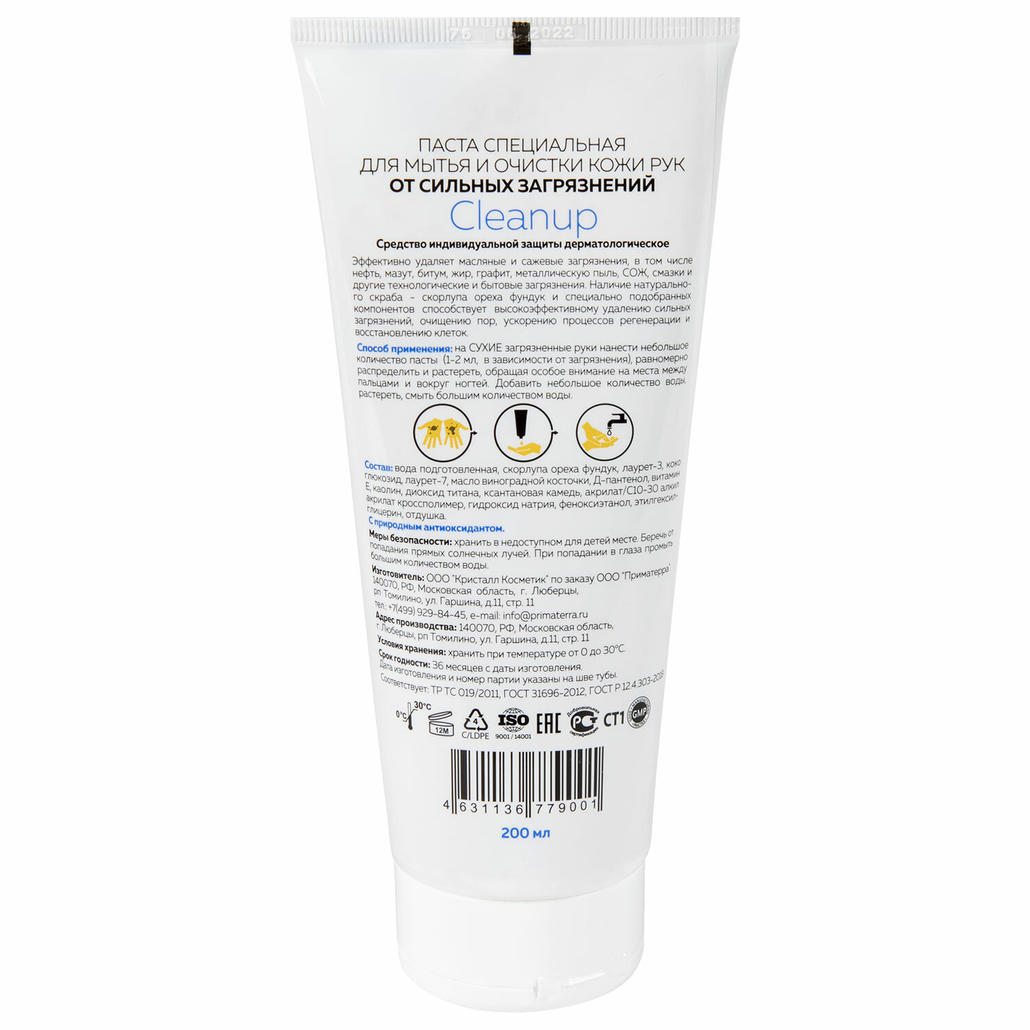Состав: — вода подготовленная; — скорлупа ореха фундук; — лаурет-3; — коко глюкозид; — лаурет-7; — масло виноградной косточки; — Д-пантенол; — витамин E; — каолин; — диоксил титана; — ксантановая камедь; — акрилат/C10-30 акрио акрилат кроссполимер; — гидроксид натрия; — феноксиэталон; — этилгексилглицерин; — отдушка. Наличие в составе натурального скраба (виноградная косточка) и природного антиоксиданта (масло виноградной косточки) способствует высокоэффективному удалению сильных загрязнений, очищению пор, ускорению процессов регенерации, замедлению процессов формирования свободных радикалов и окисления липидов. Способ применения: На сухие загрязненные руки нанести небольшое количество пасты (1-2 мл, в зависимости от загрязнения), равномерно распределить и растереть, обращая Особое внимание на места между пальцами и возле ногтей. По мере того, как грязь начнет растворяться, немного смочить руки водой и снова растереть. Смыть грязь и остатки пасты водой. Срок годности: 36 месяцев. Упаковка: флакон 200 мл.
