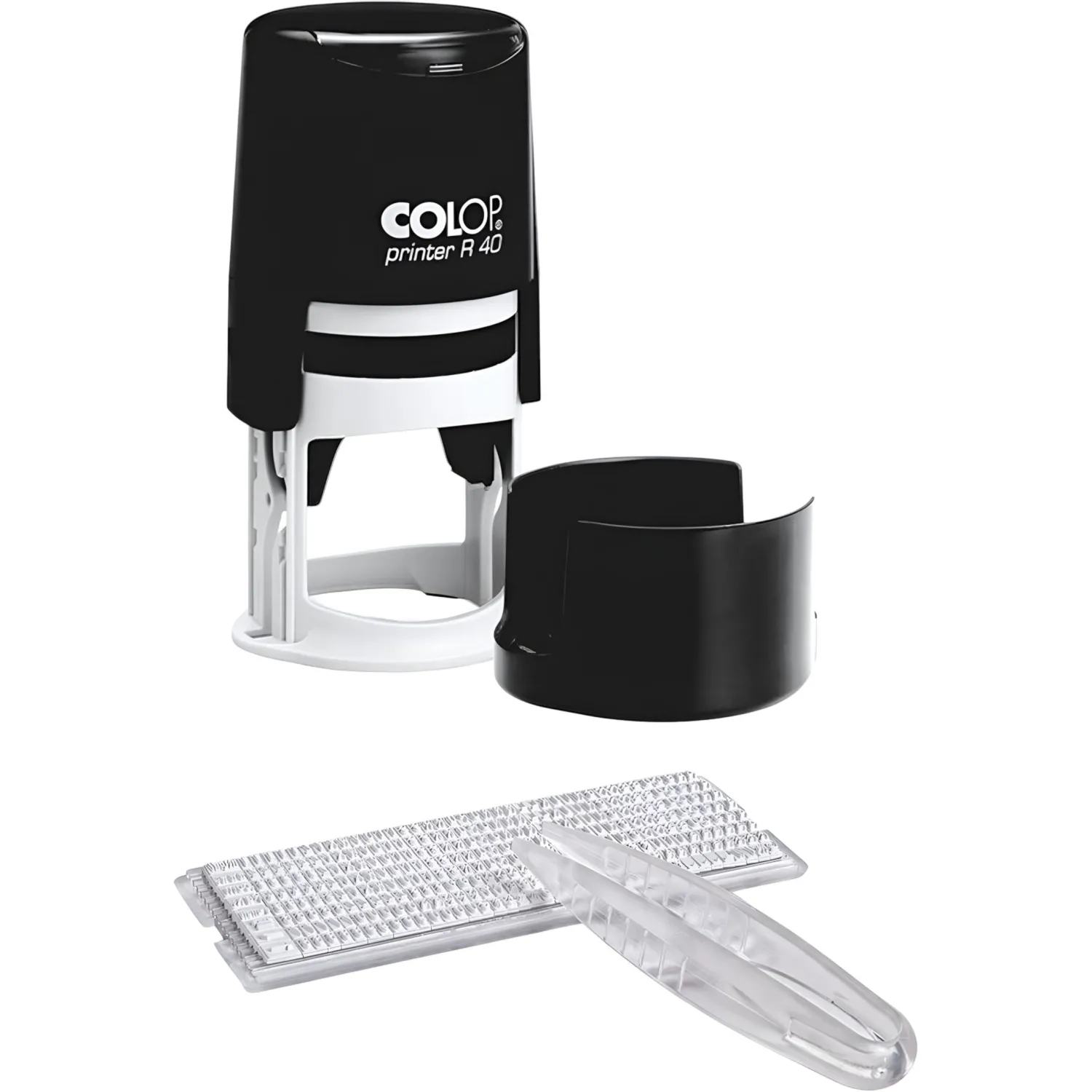 Комплект на автоматической оснастке диаметром 40 мм. В комплекте поставляется: касса букв 480 знаков, шрифт 3,1 и 2,2 мм TS с креплением на одной ножке, сменная подушка синяя Е/R40 (арт. 3255), пинцет.