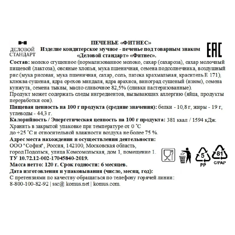 Печенье злаковое Деловой Стандарт Фитнес из орехов и сухофруктов 120 г