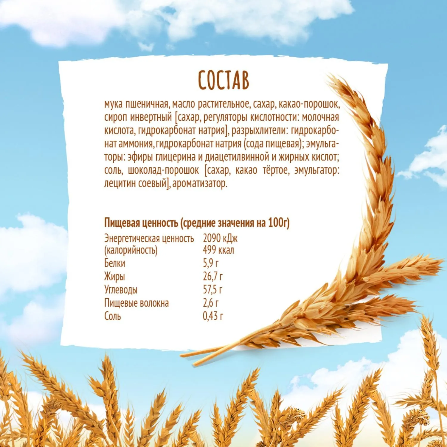 Состав: мука пшеничная, масло растительное, сахар, какао-порошок, крахмал кукурузный, глюкоза, разрыхлители: гидрокарбонат аммония (соль углеаммонийная), гидрокарбонат натрия (сода пищевая); эмульгатор: лецетин соевый, эфиры глицерина и диацетилвинной и жирной кислот; соль, шоколад-порошок (сахар, какао тёртое, эмульгатор: лецитин соевый), ароматизатор.