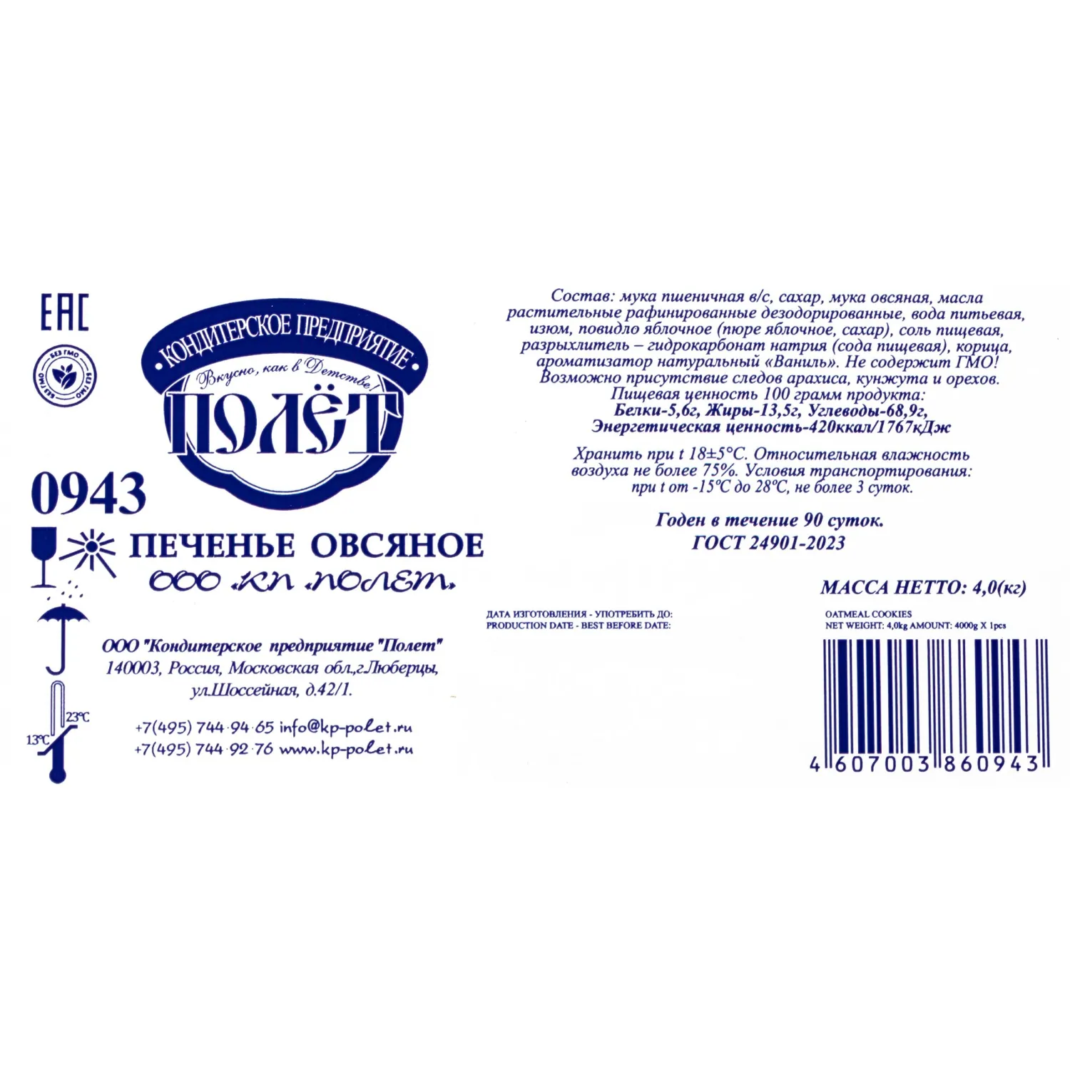 Состав: мука пшеничная, сахар песок, вода питьевая, маргарин (рафинированные дезодорированные растительные масла, вода, соль поваренная пищевая, эмульгаторы: Е471, Е475, лецитин, ароматизатор, регулятор кислотности — лимонная кислота, краситель аннато-куркумин), мука овсяная, изюм, разрыхлитель — сода пищевая, соль, корица.