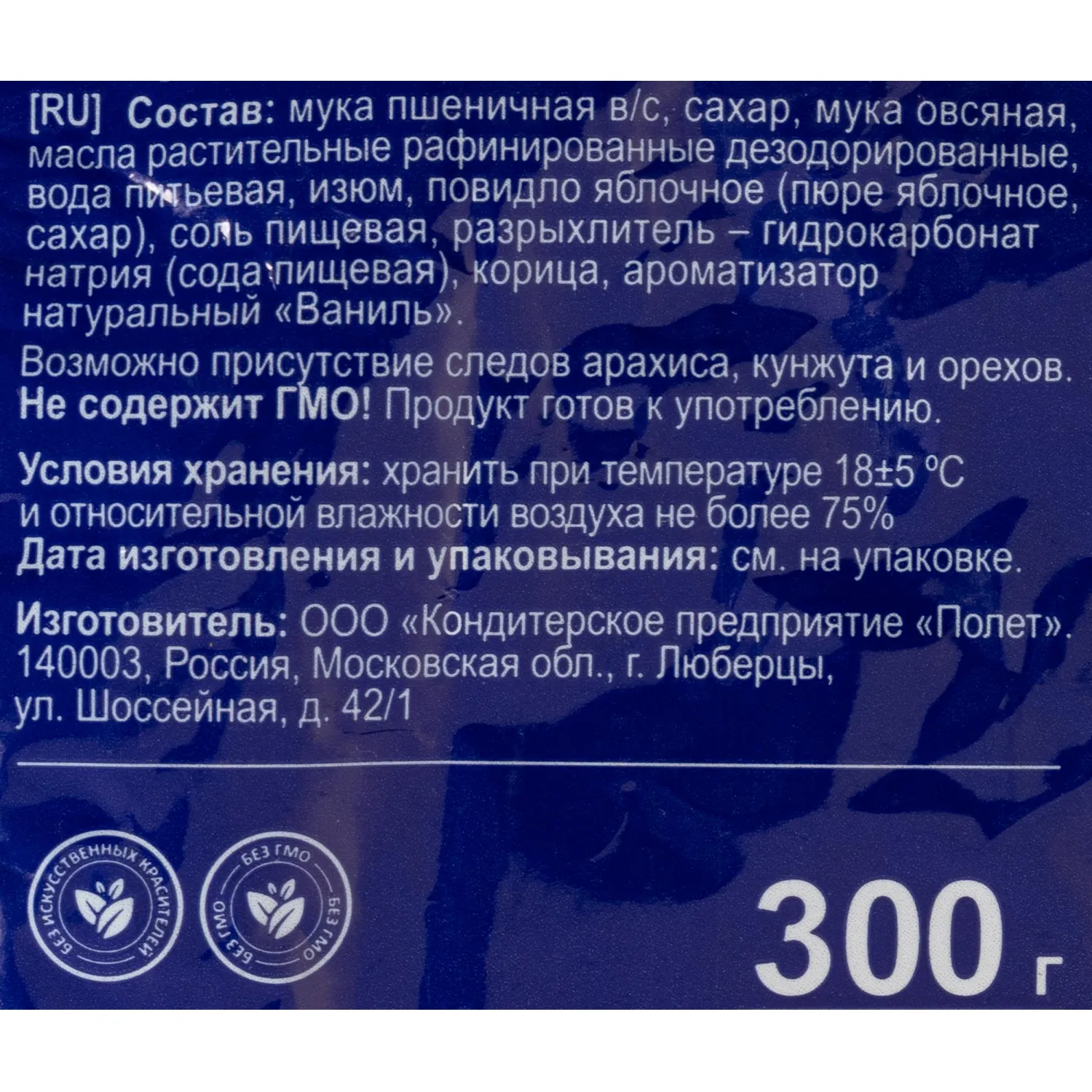 Состав: мука пшеничная, сахар, мука овсяная, масла растительные рафинированные дезодорированные, вода питьевая, изюм, соль пищевая, разрыхлитель — гидрокарбонат натрия (сода пищевая), корица, ароматизаторы.
