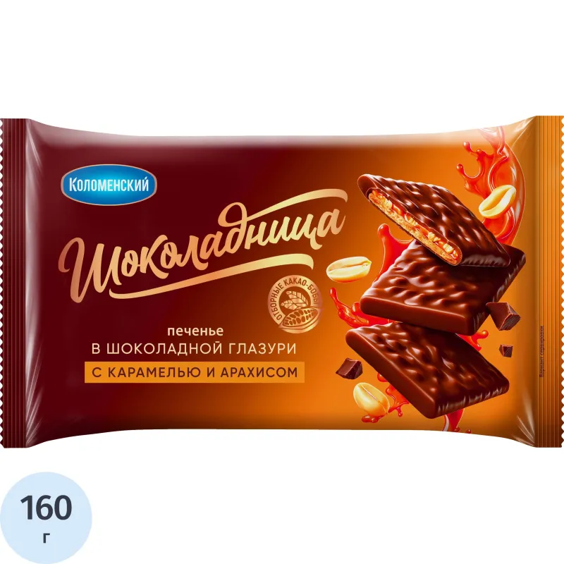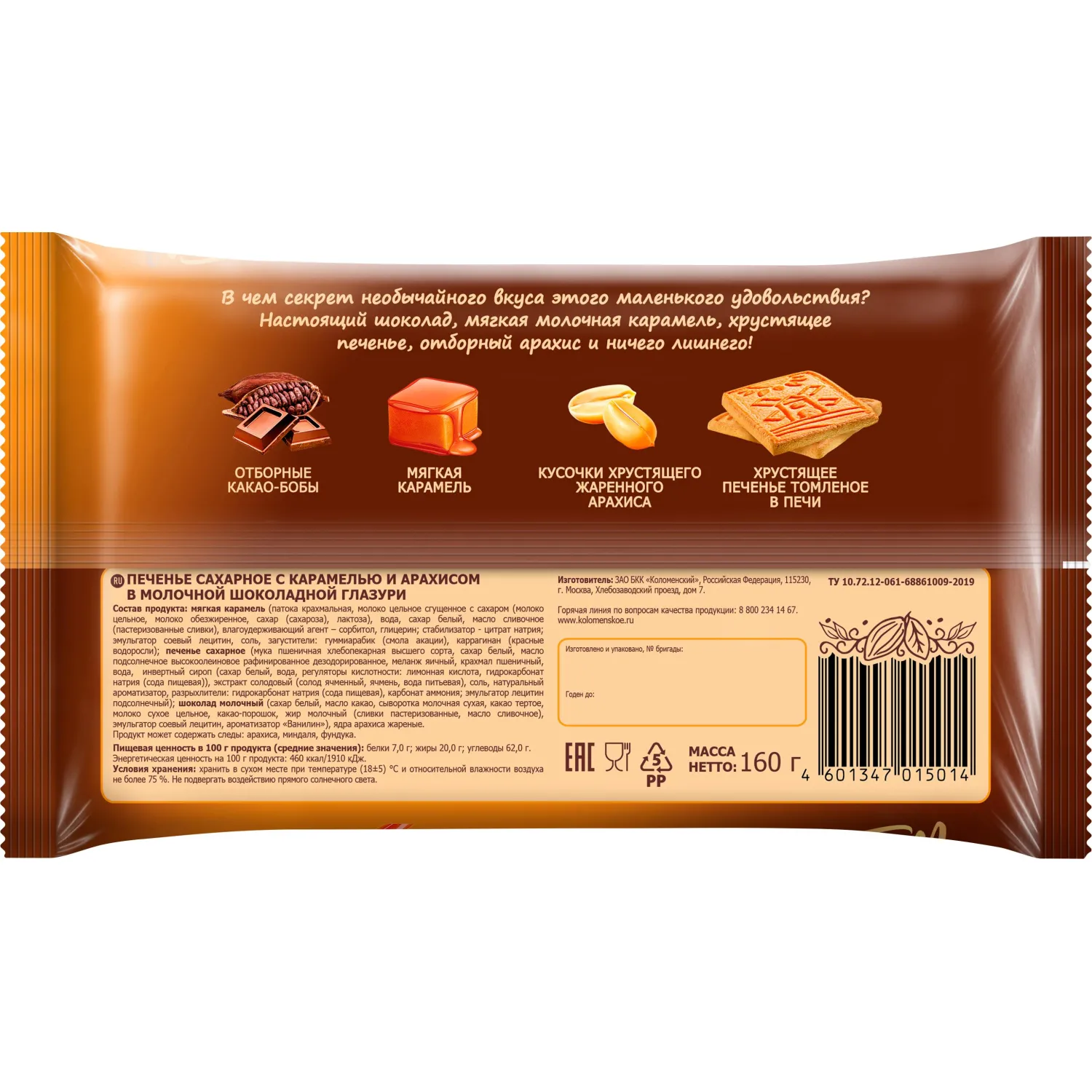 Печенье Коломенский сахарное с карамелью и арахисом в шоколадной глазури 160 г. В чем секрет необычайного вкуса этого маленького удовольствия Настоящая шоколадная глазурь, мягкая молочная карамель, хрустящее печенье, отборный арахис и ничего лишнего! Печенье «Коломенский» украсит любое чаепитие, а также может стать приятным перекусом на завтрак.
