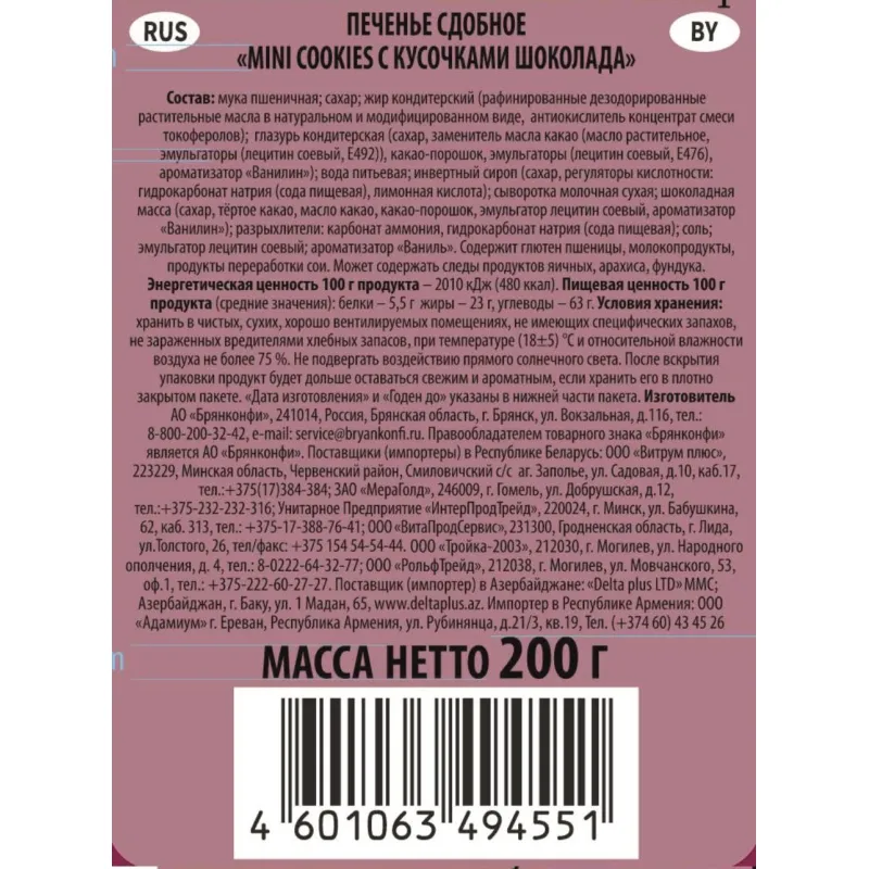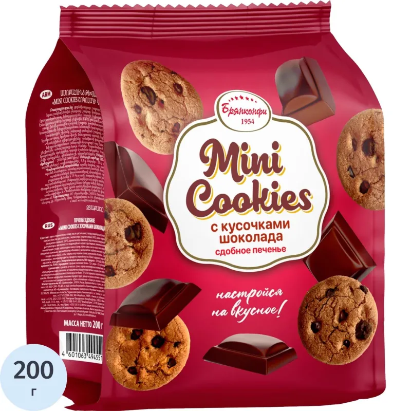 О товаре «Печенье сдобное Брянконфи Mini cookies с кусочками шоколада 200 г»