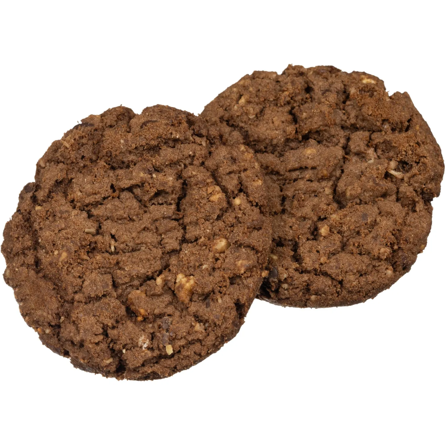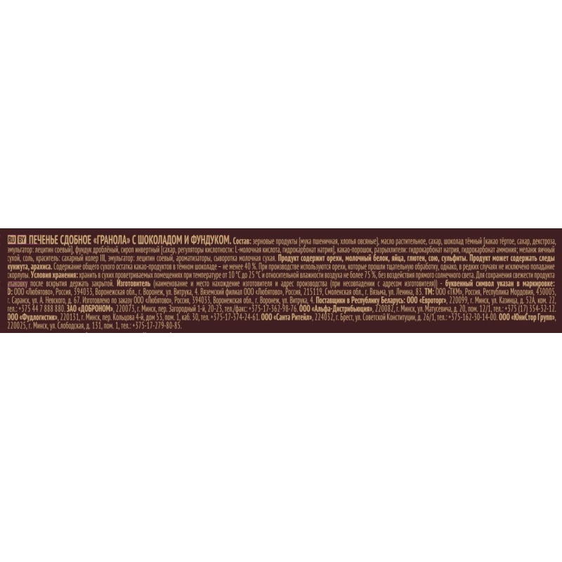 Состав: зерновые продукты (мука пшеничная, хлопья овсяные), сахар, масло растительное, тёмный шоколад (какао тёртое, сахар, декстроза, эмульгатор: лецитин соевый), фундук жареный дроблёный, сироп инвертный (сахар, регуляторы кислотности: молочная кислота, гидрокарбонат натрия), какао-порошок, разрыхлители: гидрокарбонат аммония, гидрокарбонат натрия (сода пищевая); меланж яичный сухой, соль, краситель: сахарный колер III, эмульгатор: лецитин соевый, ароматизаторы. Содержание общего сухого остатка какао в тёмном шоколаде составляет 49%. Продукт содержит яйца, глютен, сою, сульфиты, орехи. Продукт может содержать следы молочного белка.