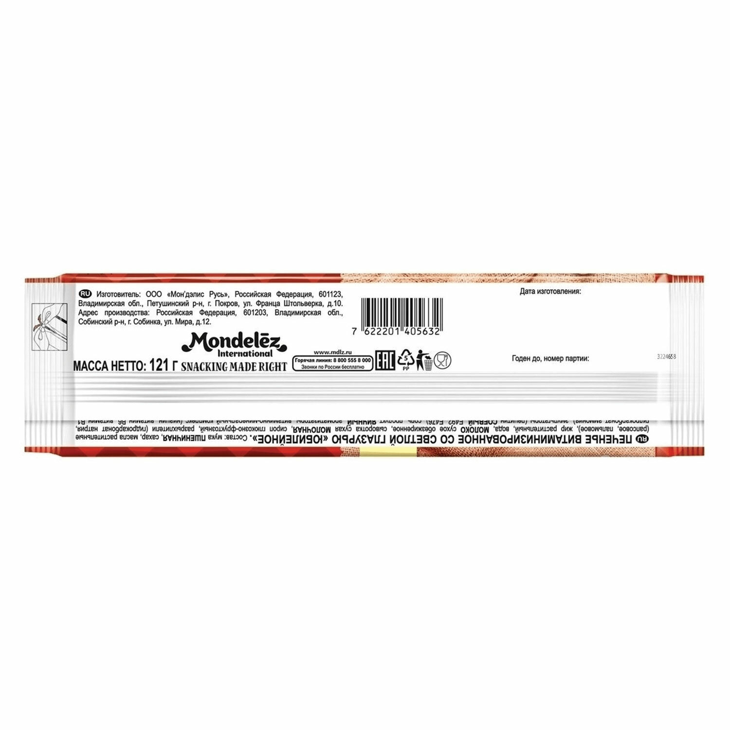Пищевая ценность: белки — 6,8 г, жиры — 22,0 г, углеводы — 65,0 г. Вес 121 г.