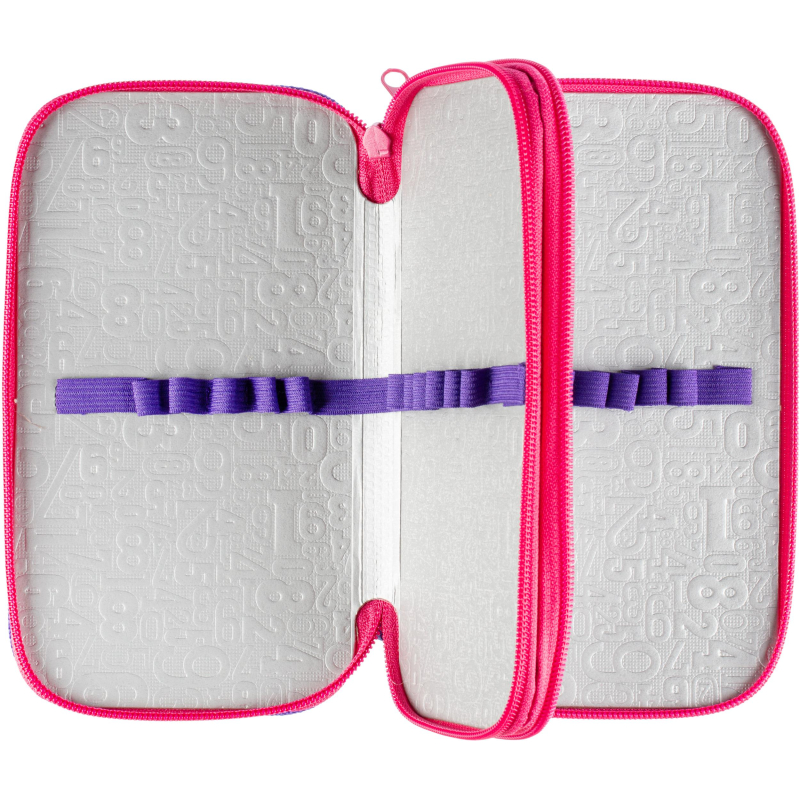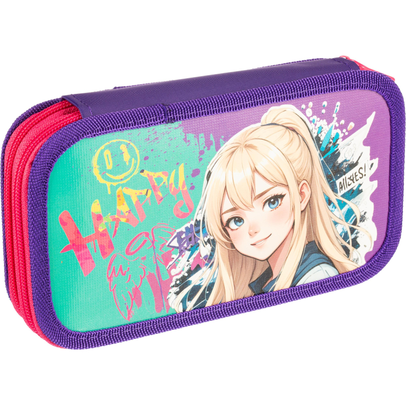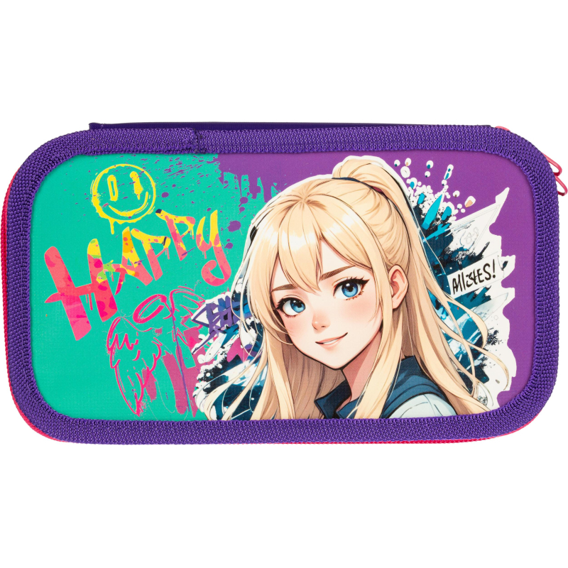 Дизайн с изображением девочки и надписями делает пенал ярким и привлекательным аксессуаром для школьниц.