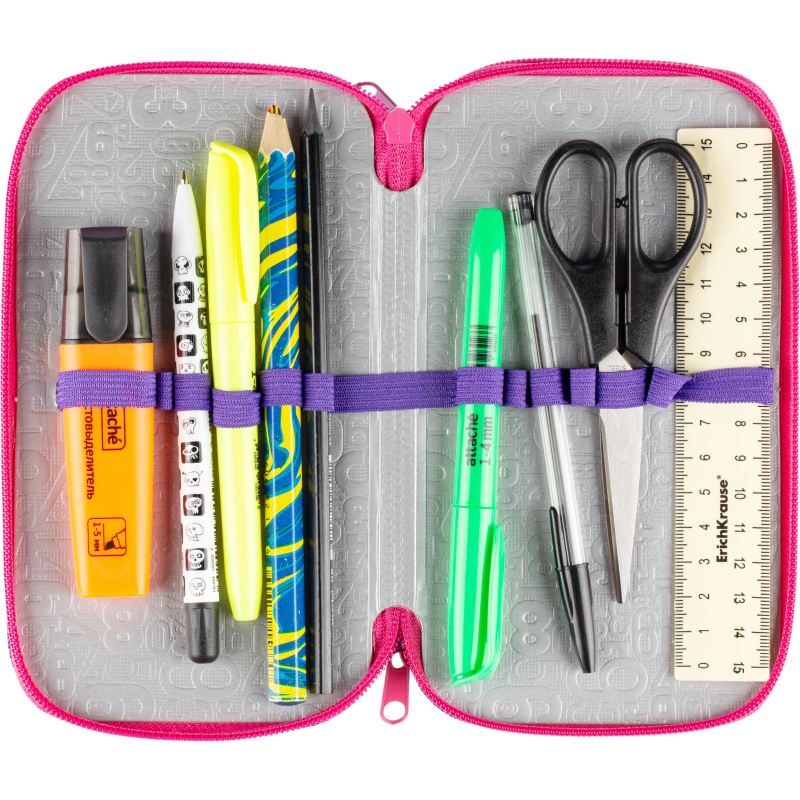 Изделие не имеет наполнения, поэтому его можно укомплектовать по собственному выбору. Размер пенала — 19×10.5×3.5 см, он компактный и легко помещается в портфель или рюкзак.