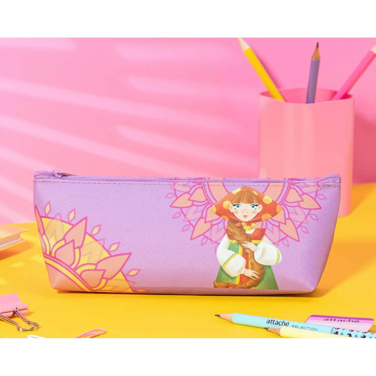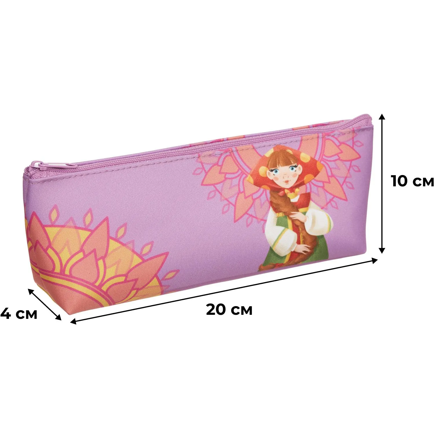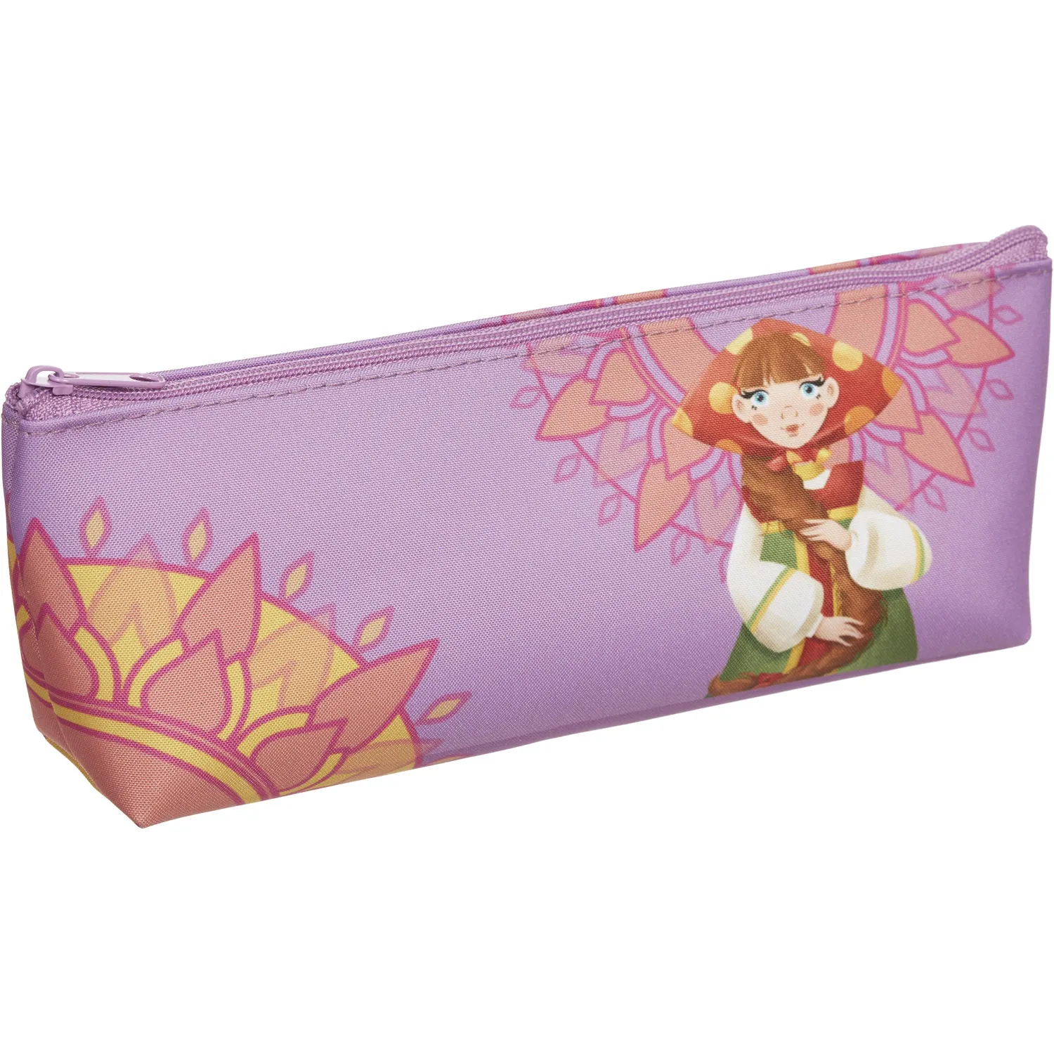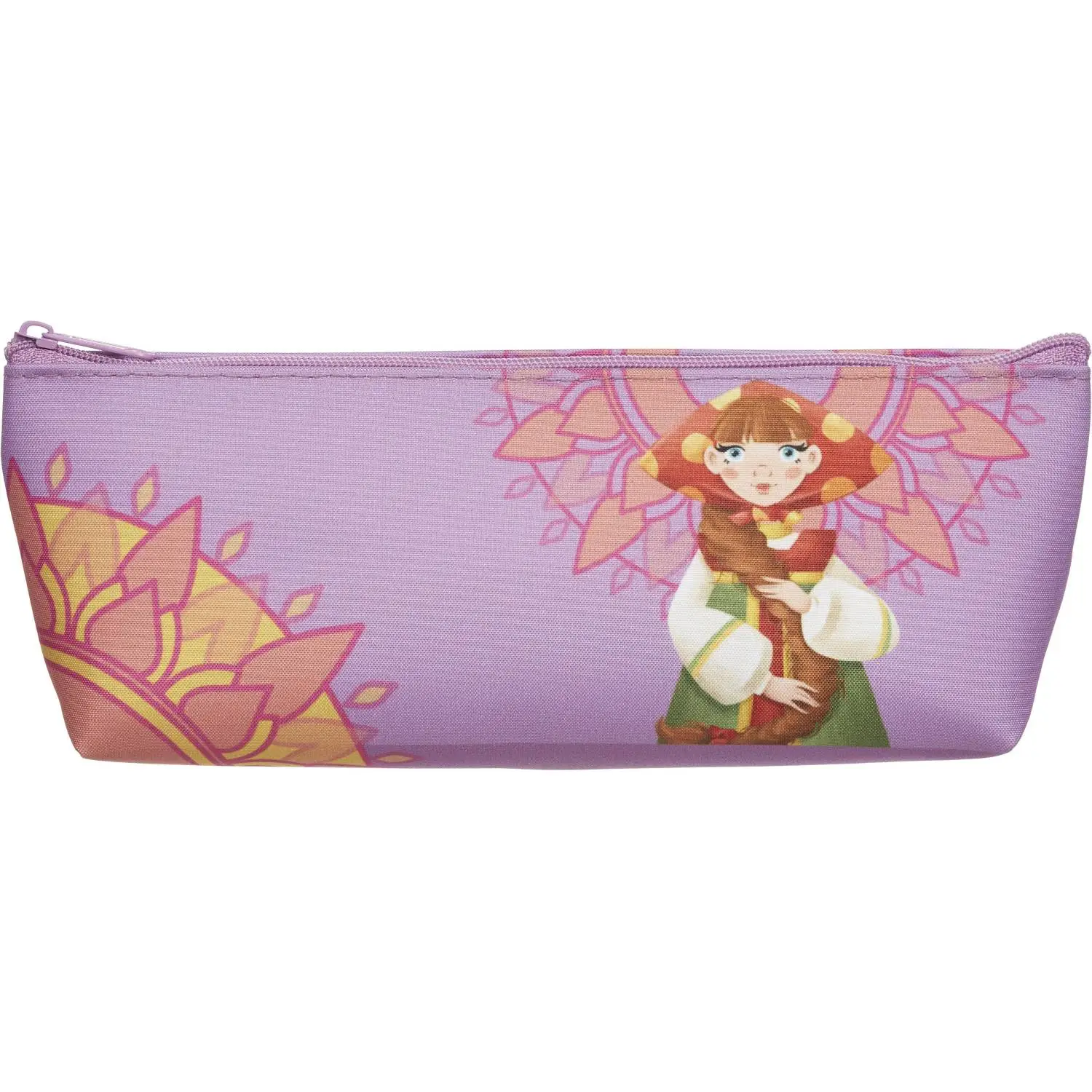 Пенал-косметичка Комус Три богатыря Любава. Вместительное отделение для канцелярских принадлежностей застегивается на молнию. Изготовлен из полиэстера. Без наполнения. Размер: 20×10×4 см. Дизайн: героиня мультфильма 'Три богатыря' — Любава.