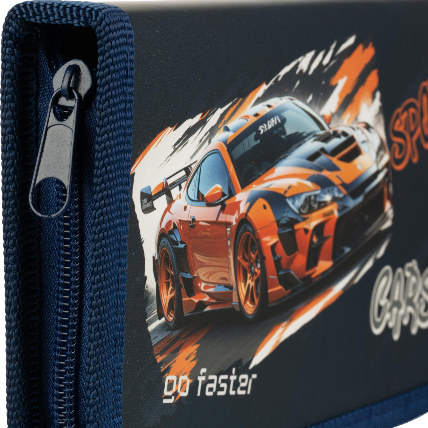 Изделие изготовлено из картона и полиэстера. Жёсткая основа сохраняет форму, а внешний слой устойчив к загрязнениям и износу. Яркий дизайн с изображением спортивных автомобилей делает пенал привлекательным для юных автолюбителей. Размер 19×11×2.7 см позволяет без труда разместить его в школьном рюкзаке.