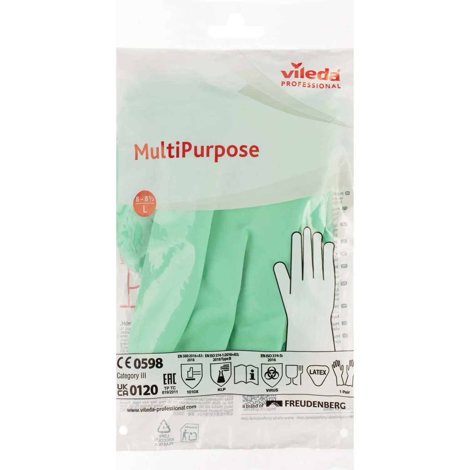Перчатки латексные Vileda Professional с хлопковым напылением зелёные (размер 8-8.5, L, 174365) предназначены для широкого круга задач: профессиональной уборки помещений. Перчатки с ограничением подходят для работы с продуктами питания в столовых, кафе, барах и на кухнях. Подходят для использования с разведёнными моющими средствами и дезинфектантами. Применимы для работы на сухих и влажных участках. Идеальны для уборки коммерческой и некоммерческой недвижимости, объектов здравоохранения, производств и HoReCa.