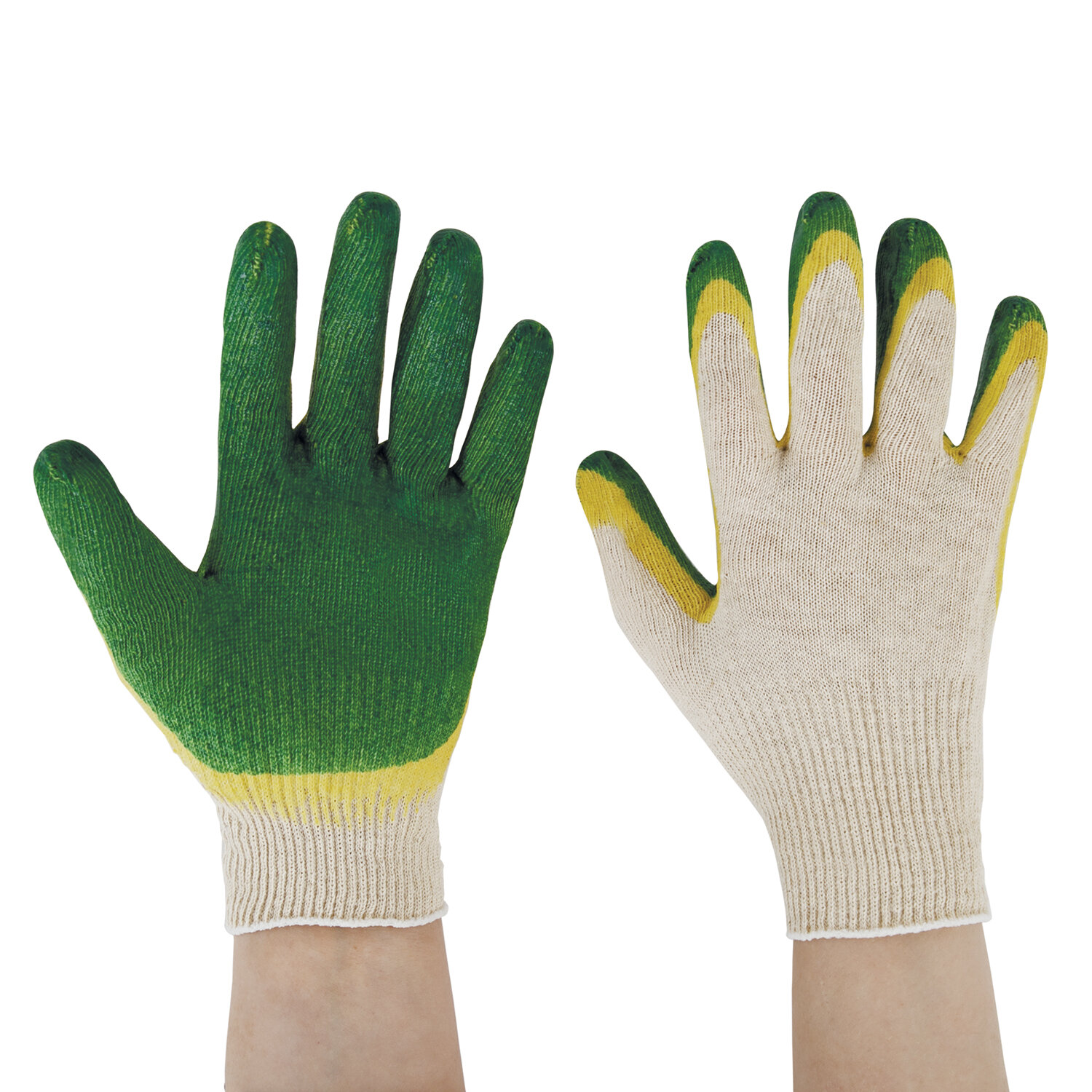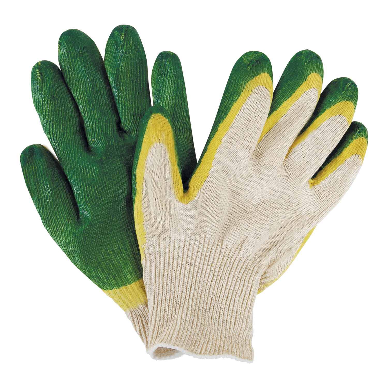 Изготовлены из хлопчатобумажной пряжи плотностью 100 текс с покрытием из поливинилхлорида с нанесением рисунка на внутреннюю сторону перчатки. Двойной латексный облив помогает обеспечить плотный захват и предотвращает соскальзывание детали. Резинки на манжетах обеспечивают плотное прилегание перчатки к руке. Перчатки белого цвета имеют 13 класс вязки. Вес пары – 36-37 г. Поставляются в комплекте 5 штук в полиэтиленовой упаковке.