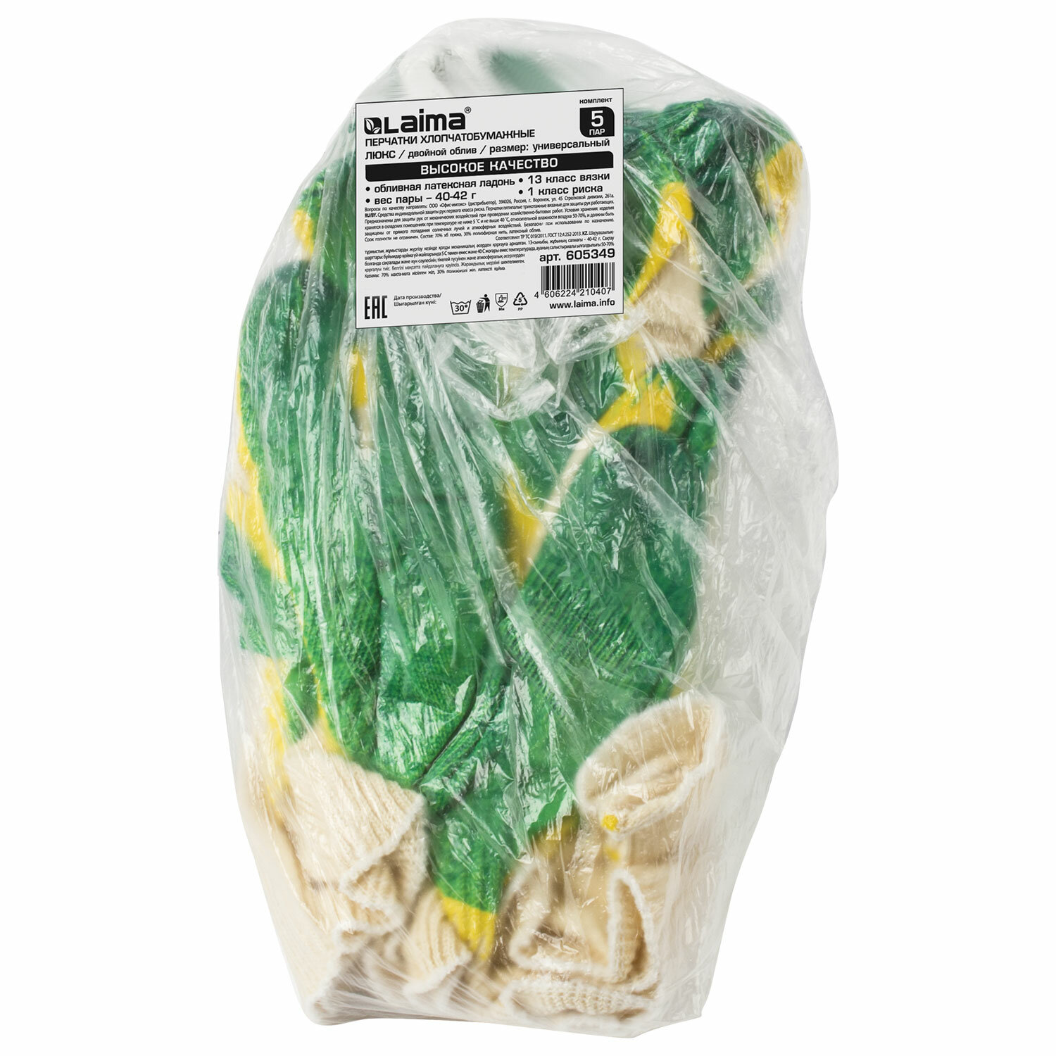 О товаре «Перчатки хлопчатобумажные износостойкие, ДВОЙНОЙ латексный облив, 13 класс, КОМПЛЕКТ 5 ПАР, LAIMA ЛЮКС, 605349»