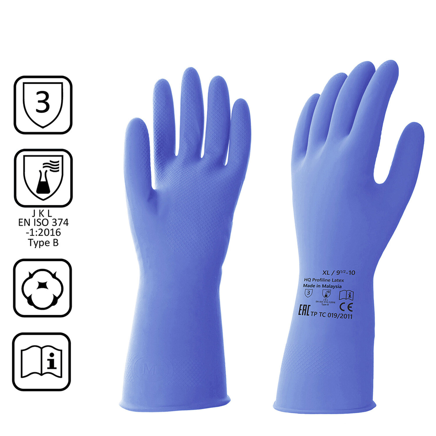 Перчатки КЩС латексные Hq Profiline с хлопковым напылением синие (размер 10, XL, 74736)