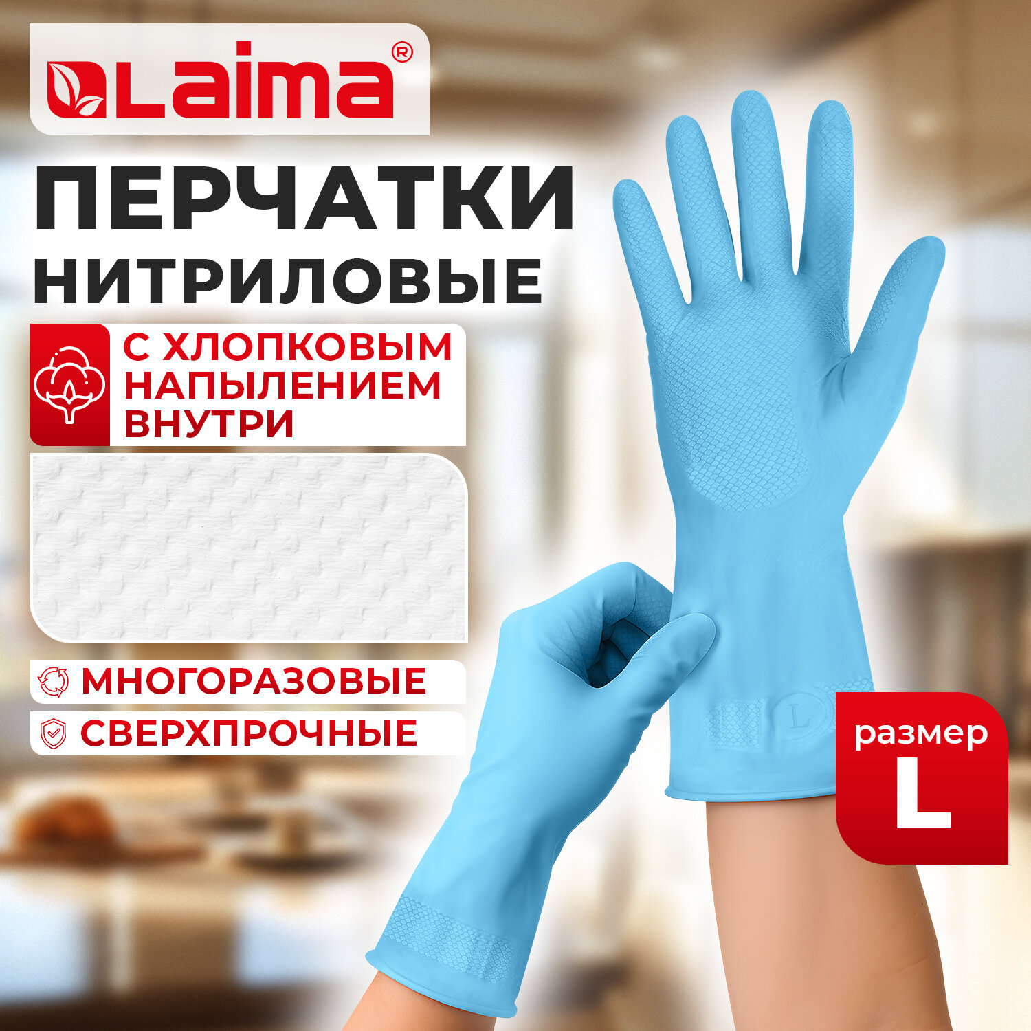 Перчатки МНОГОРАЗОВЫЕ нитриловые LAIMA ГИПОАЛЛЕРГЕННЫЕ, хлопчатобумажное напыление, ПРОЧНЫЕ, размер 8-9, L (большой), синие, вес 38г, 604999