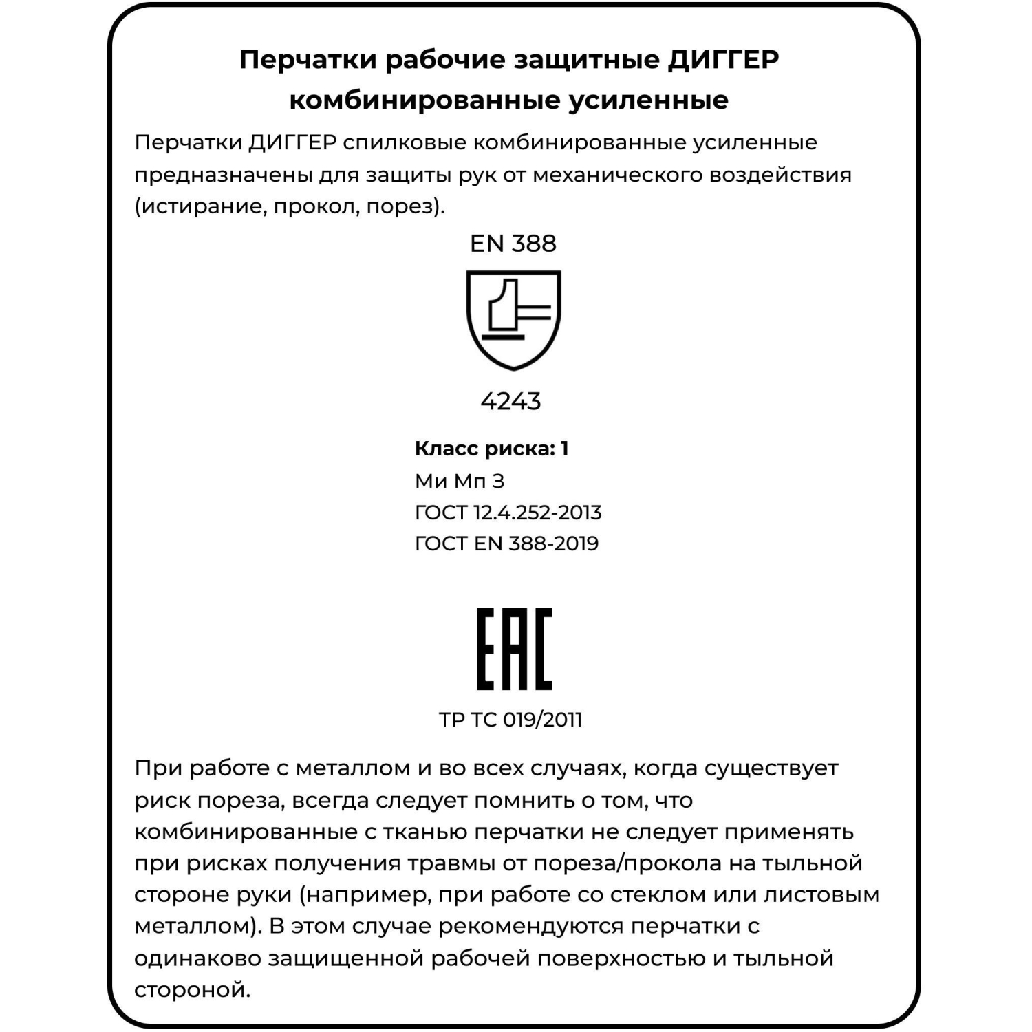 Перчатки соответствуют стандартам ТР ТС 019/2011, ГОСТ 12.4.252-2013, ГОСТ EN 388-2019. Эксплуатационные уровни по EN 388-4243. Защитные свойства: Ми Мп З.