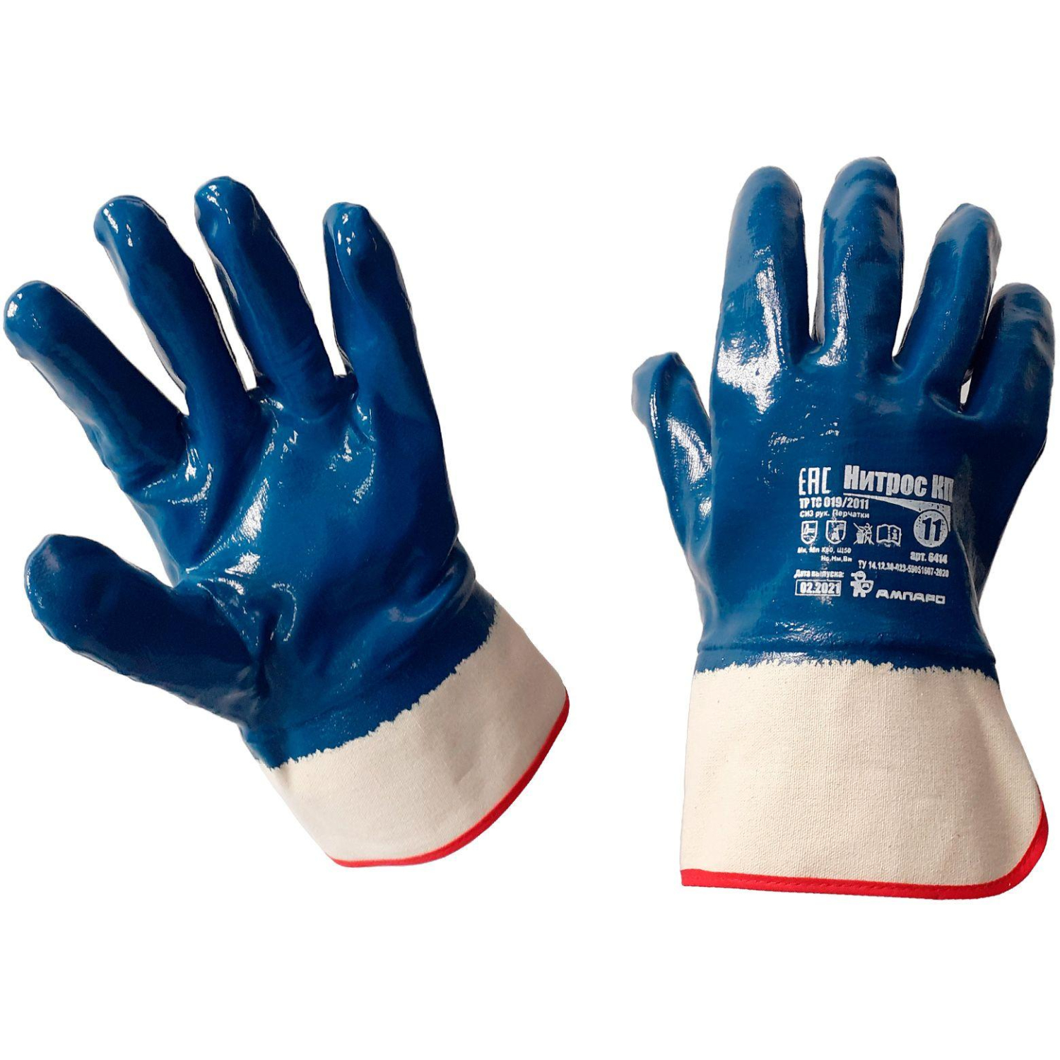 Рабочие защитные перчатки Ампаро Нитрос КП размер 10 (XL) с полным нитрильным покрытием и краговой манжетой предназначены для тяжелых работ с металлоконструкциями, строительными, абразивными и другими материалами, а также для работы с различными инструментами. Эти перчатки подходят для условий, требующих защиты от воздействия минеральных масел, кислот, щелочей, нефти, нефтепродуктов и воды.