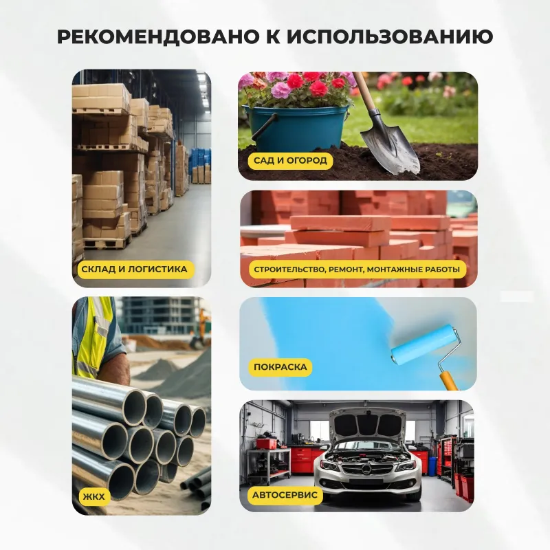 Основной материал — трикотажная ткань джерси, манжет и часть поверхности покрыты нитрилом. Перчатки рекомендуется использовать для обработки грубых поверхностей, сборки и обслуживания оборудования, складских операций и строительных работ.