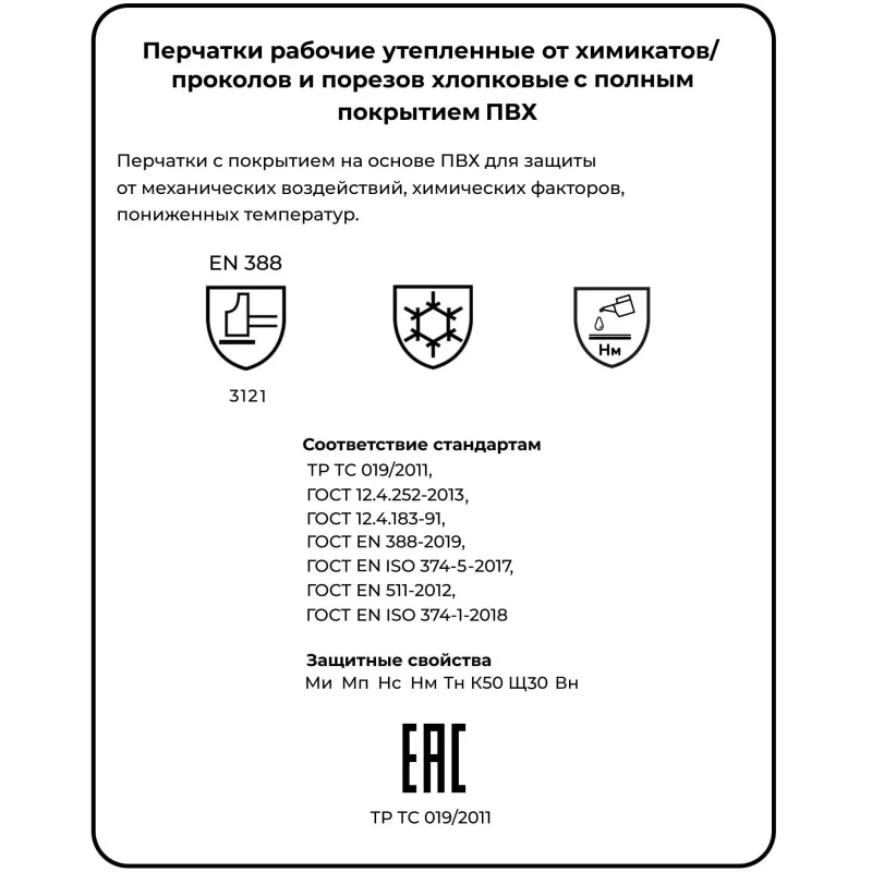 Перчатки соответствуют стандартам ГОСТ EN 511-2012, ТР ТС 019/2011, ГОСТ EN 388-2019, ГОСТ EN ISO 374-1-2018, ГОСТ EN ISO 374-5-2017. Эксплуатационный уровень: EN 388-4121. Расшифрока: