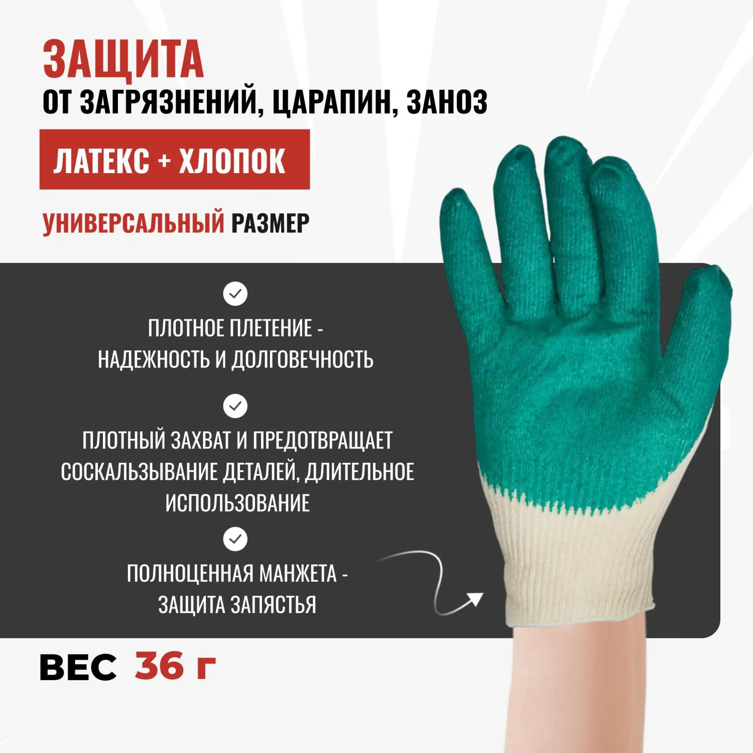 О товаре «Перчатки рабочие защитные СВС хлопковые с латексным покрытием белые/зелёные (13 класс, универсальный размер, 10 пар в упаковке)»