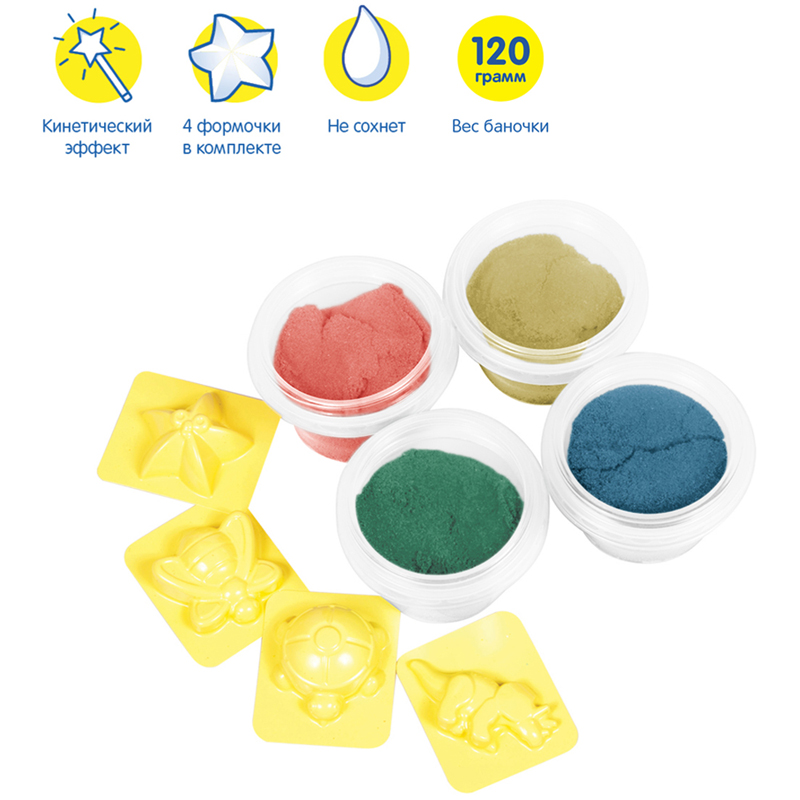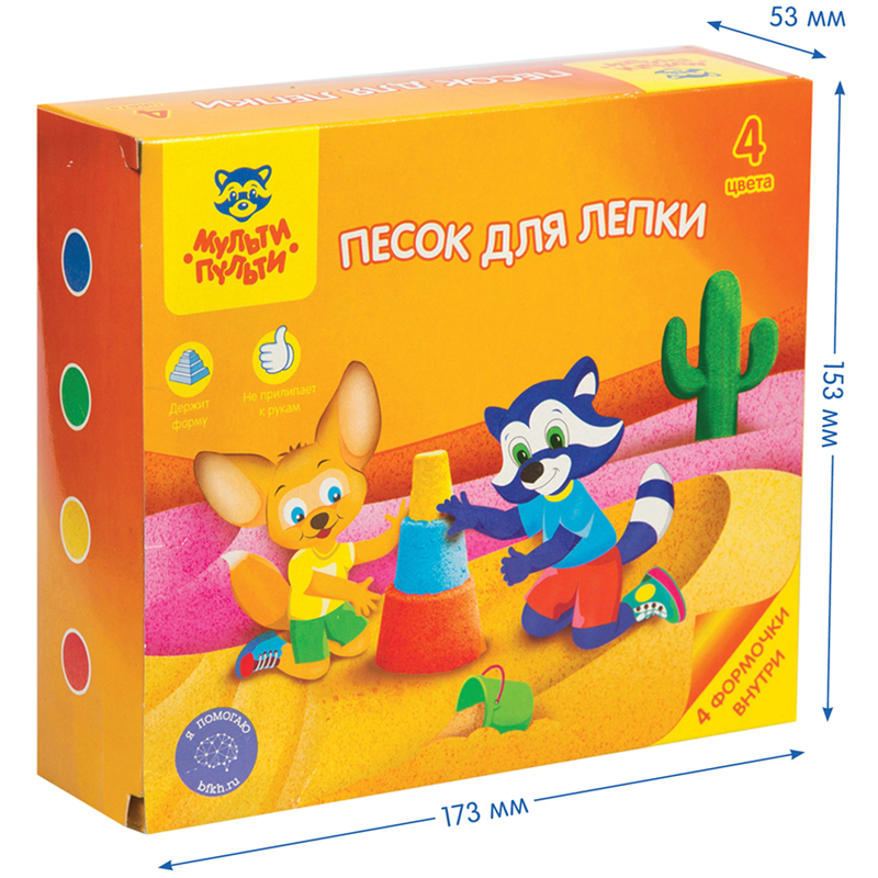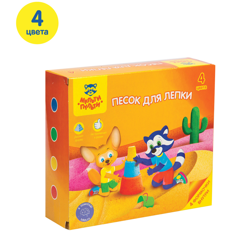 Набор песка для лепки «Мульти-Пульти» серия «Енот в пустыне» из четырёх ярких цветов: красный, желтый, зеленый, синий и формочки. Вес одной баночки – 120 г. Магический песок обладает кинетическим эффектом и достаточно пластичен, не сохнет, хорошо держит форму и лепится с помощью формочек или просто руками. С его помощью легко проявить фантазию и сделать яркие поделки. Удобная картонная коробка позволит все аккуратно хранить в одном месте. Подходит для детей старше трёх лет.