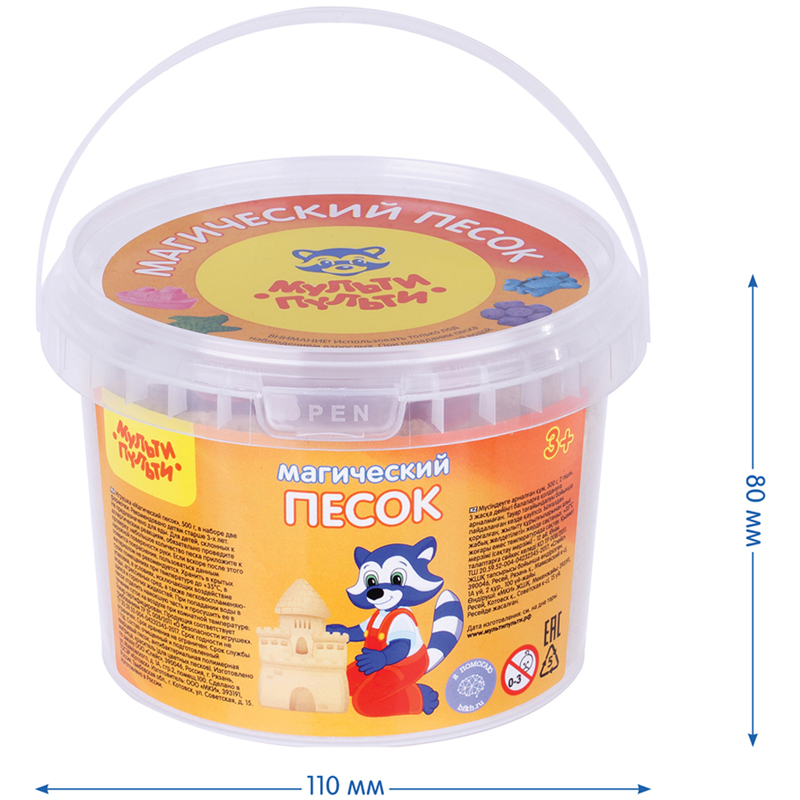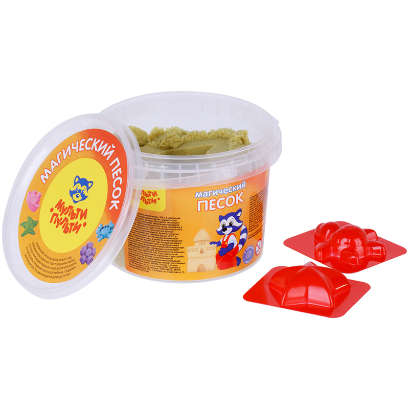 Песок для лепки «Мульти-Пульти» серия «Магический песок» весом 500 граммов в пластиковом ведре. В состав набора входят две формочки для лепки. Цвет – жёлтый. Магический песок обладает кинетическим эффектом и достаточно пластичен, не сохнет, хорошо держит форму и лепится с помощью формочек или просто руками. Подходит для детей старше трёх лет.
