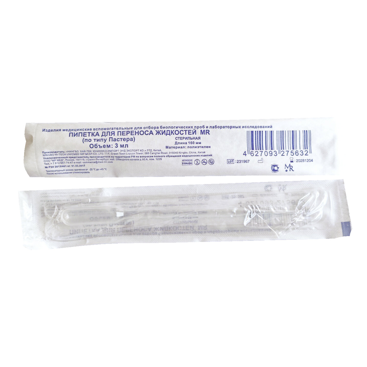 О товаре «Пипетка Пастера стерильная 3 мл, КОМПЛЕКТ 250 шт., MR MED»