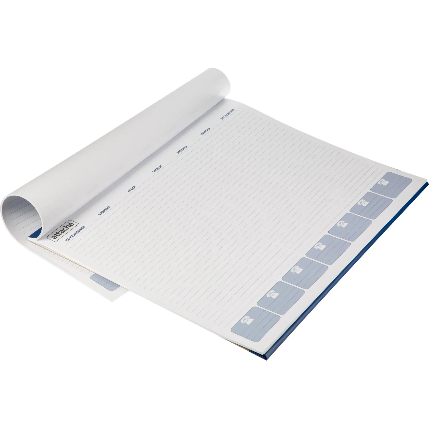 Недатированный планинг предназначен для эффективного планирования рабочего, учебного и личного времени. Он позволяет удобно зафиксировать информацию о предстоящих встречах, совещаниях и прочих событиях. Обложка отсутствует. Планинг выполнен в универсальном офисном стиле. Тип крепления — склейка. Внутренний блок сделан из офсетной бумаги плотностью 80 г/кв.м, имеет перфорацию. На одном листе помещаются записи и даты на одну неделю. Информационно-справочный блок содержит пространство для внесения личных данных и ведения заметок. Размеры изделия составляют 575×450 мм.