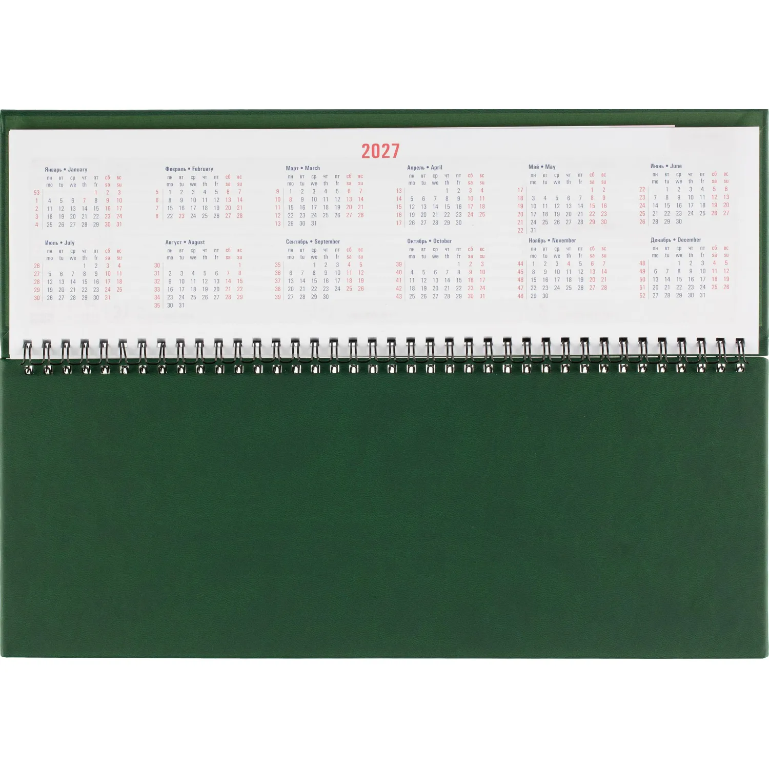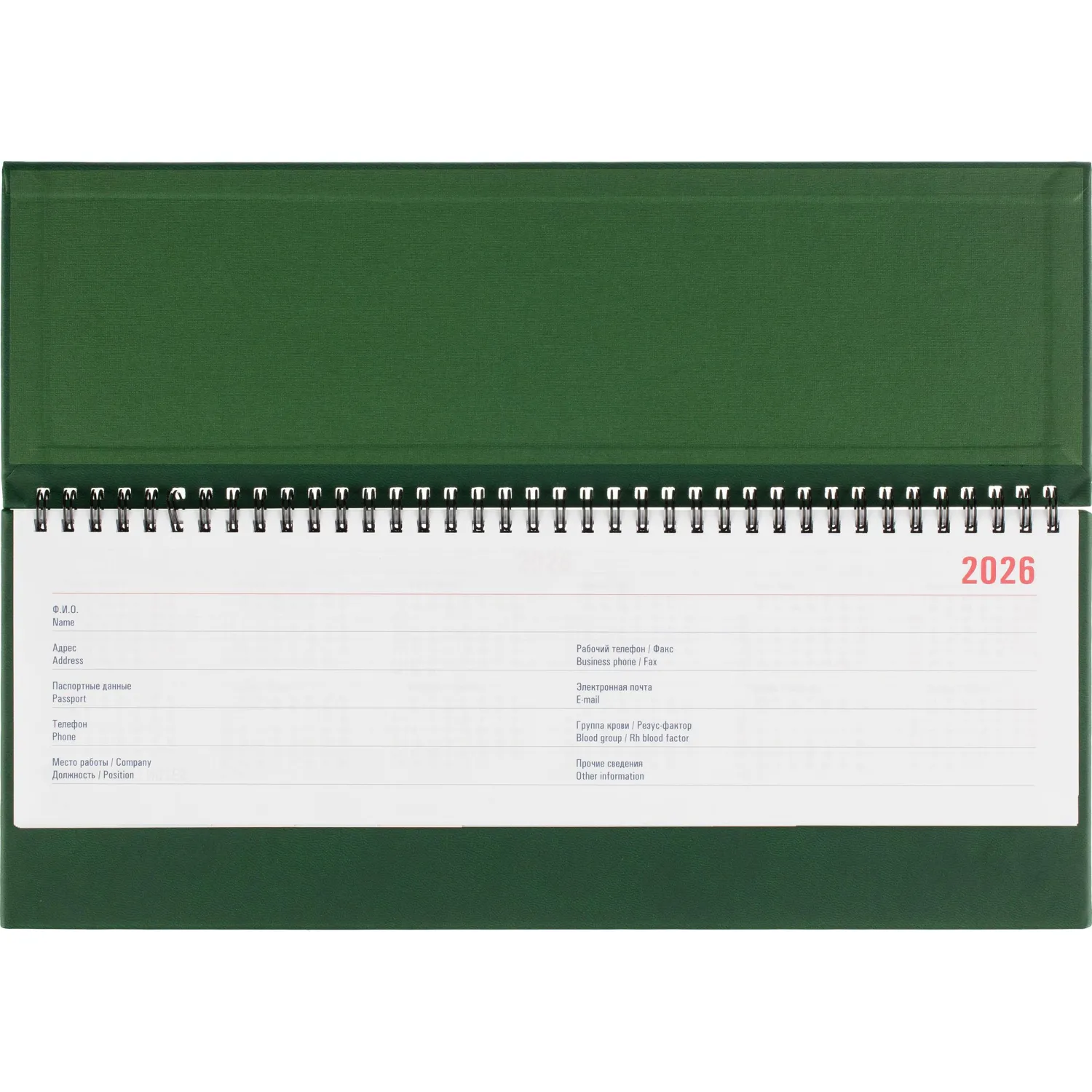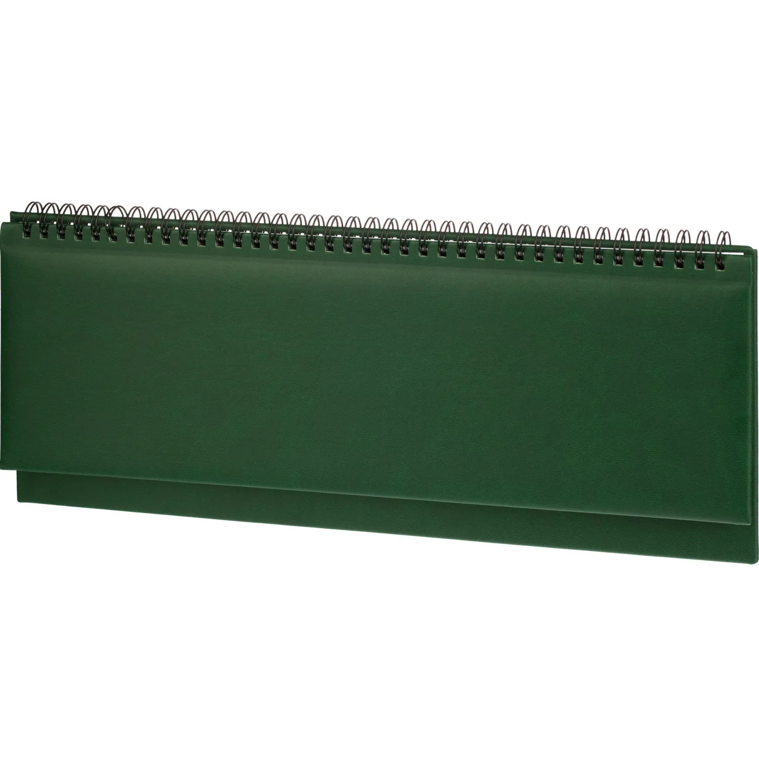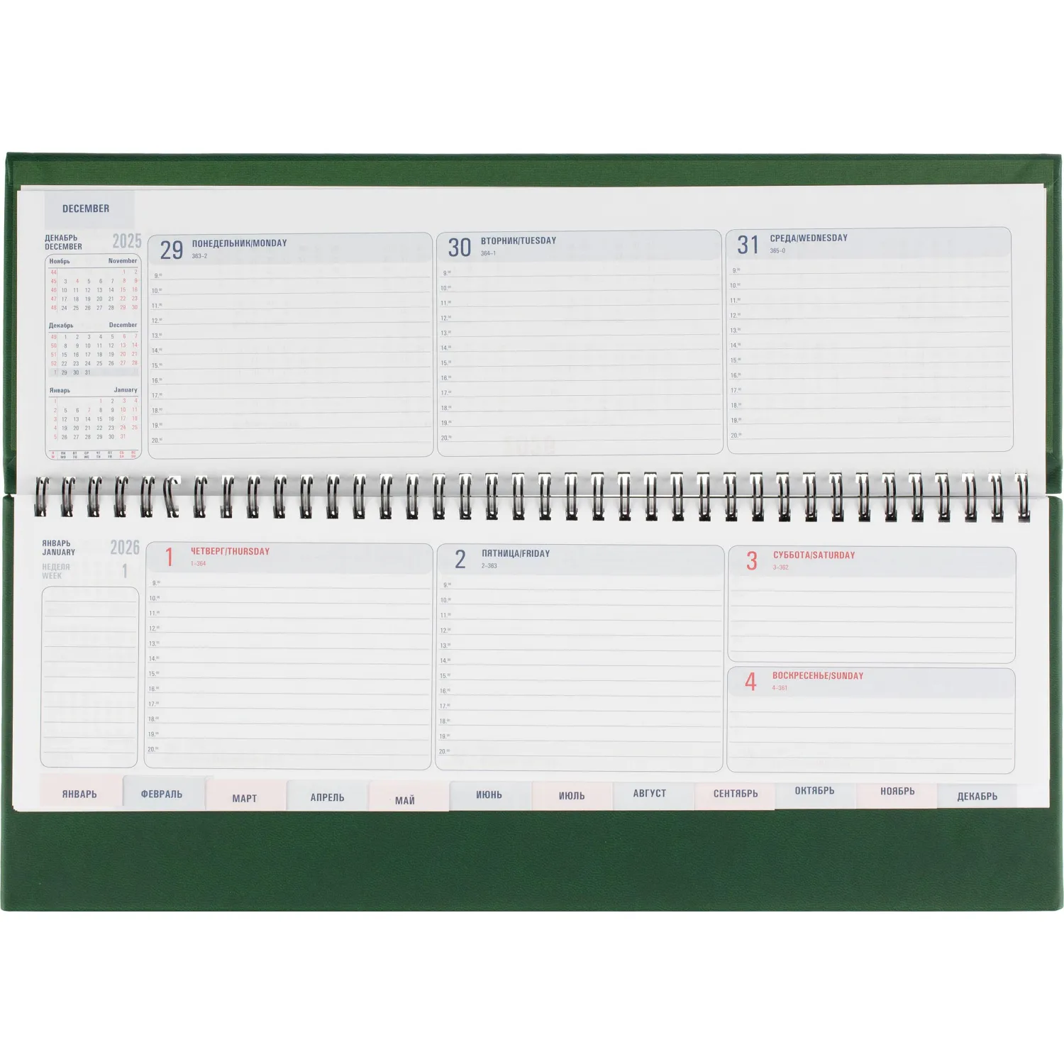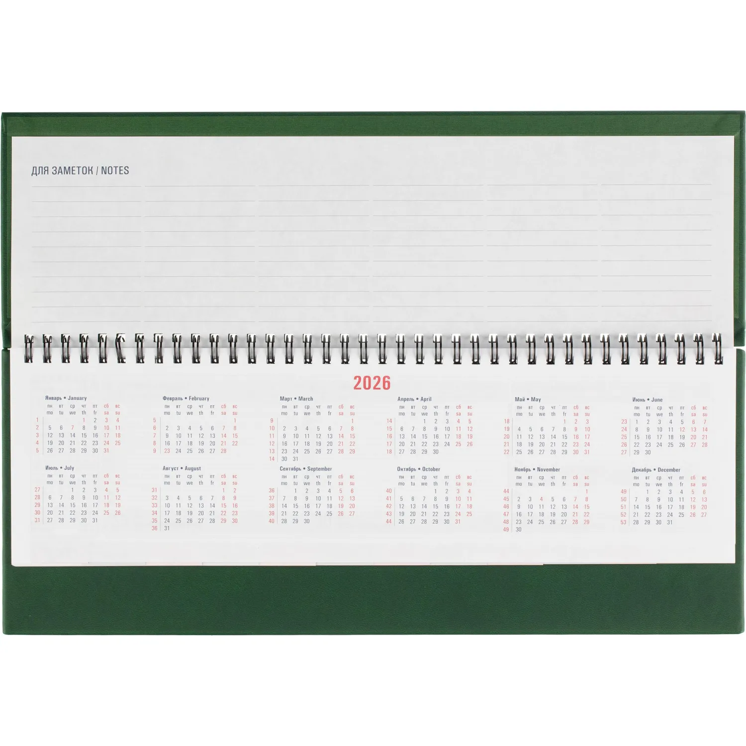 Планинг датированный на 2026 год. Формат: 340×130 мм. Цвет: зеленый. Блок 110 страниц (55 листов) в 2 краски. Бумага офсетная 70 г/кв.м. Календарь на 2025-2026 г. Вырубка блока по месяцам. Твердая обложка выполнена из искусственной кожи высокого качества. Возможно нанесение логотипа на обложку, любым способом тиснения (блинт или фольга).