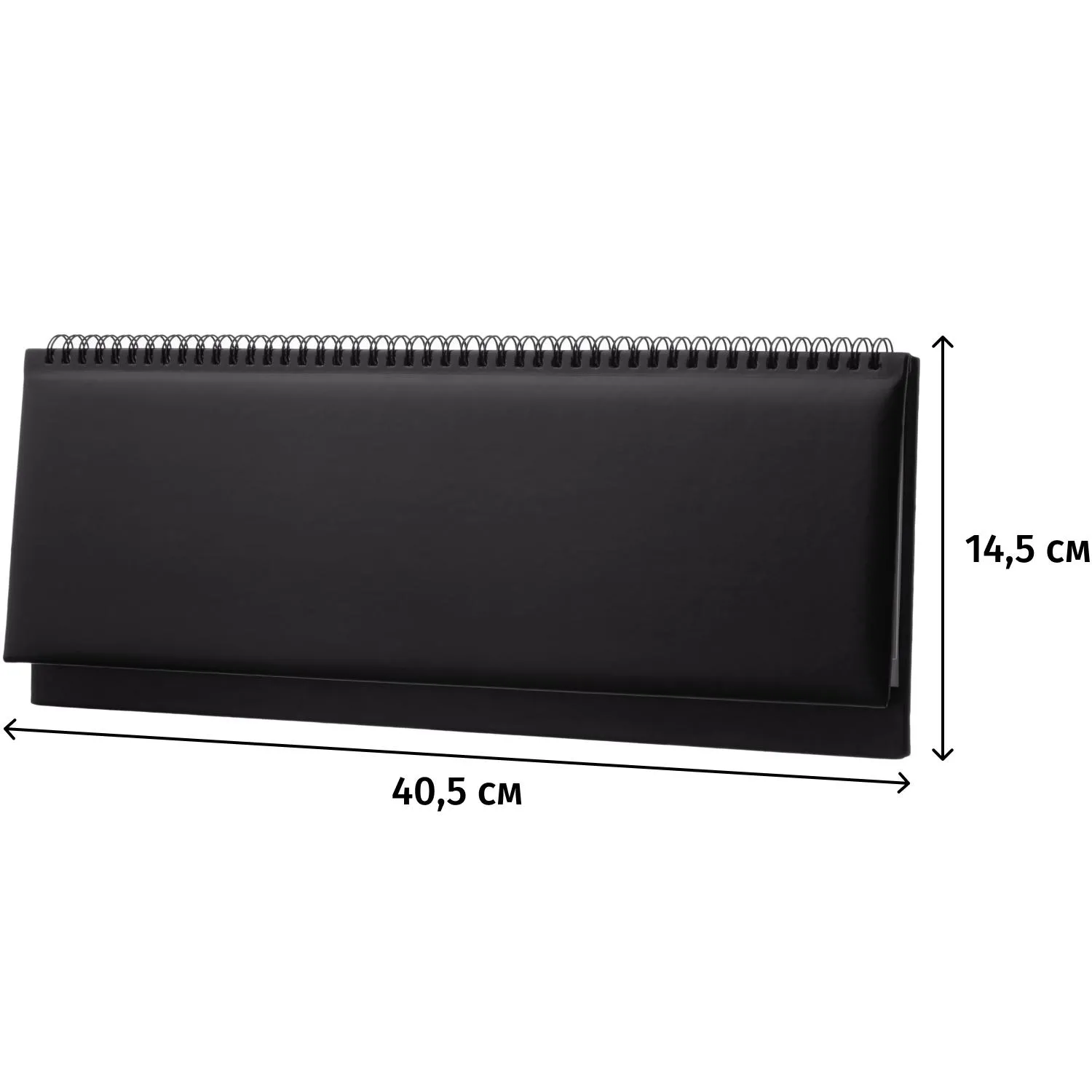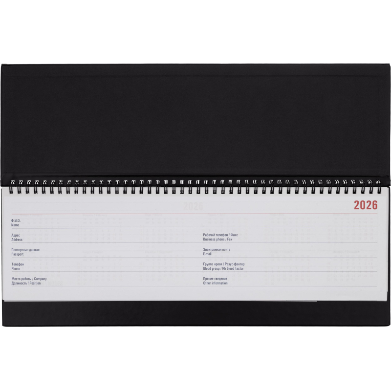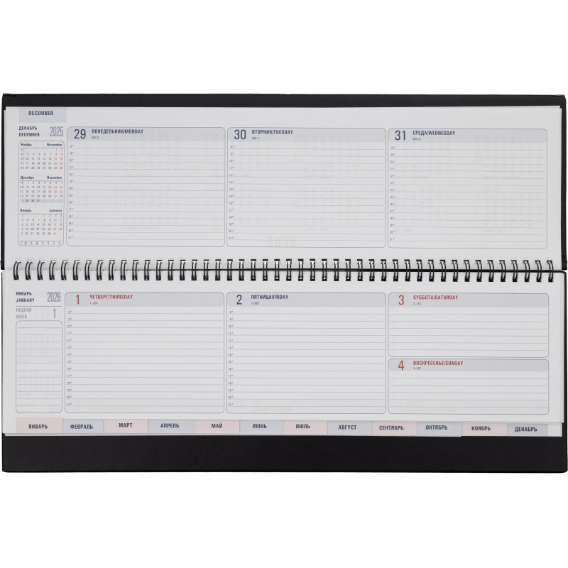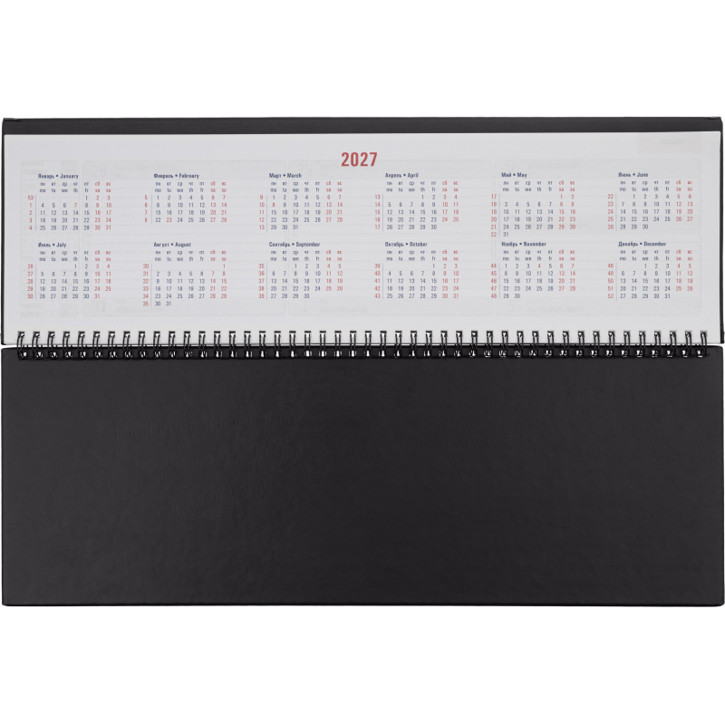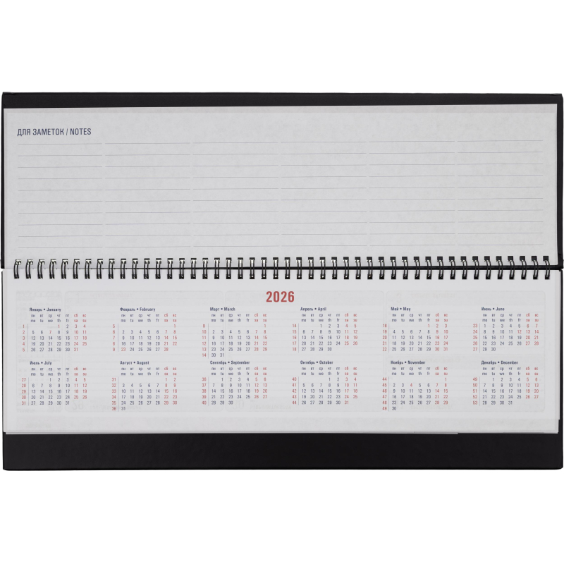 Планинг датированный на 2026 год. Формат: 405×145 мм. Цвет: черный. Блок 110 страниц (55 листов) в 2 краски. Бумага офсетная 70 г/кв.м. Календарь на 2025-2026 г. Вырубка блока по месяцам. Твердая обложка выполнена из искусственной кожи высокого качества. Возможно нанесение логотипа на обложку, любым способом тиснения (блинт или фольга).