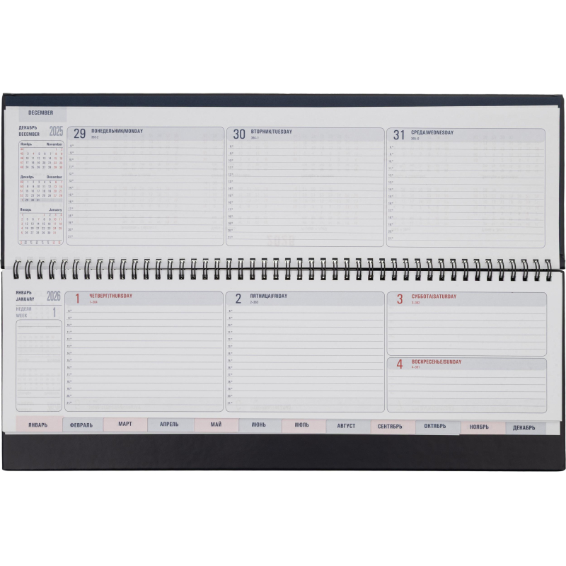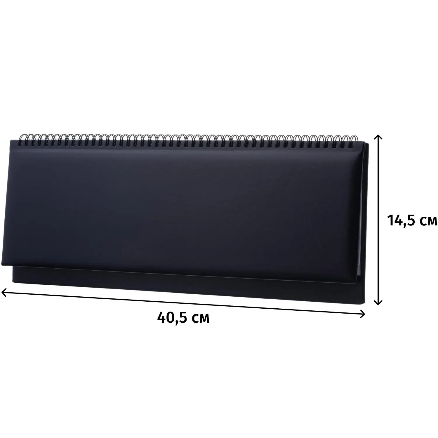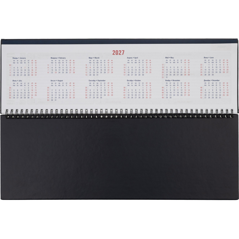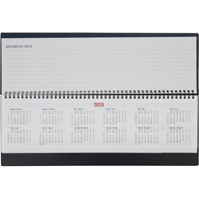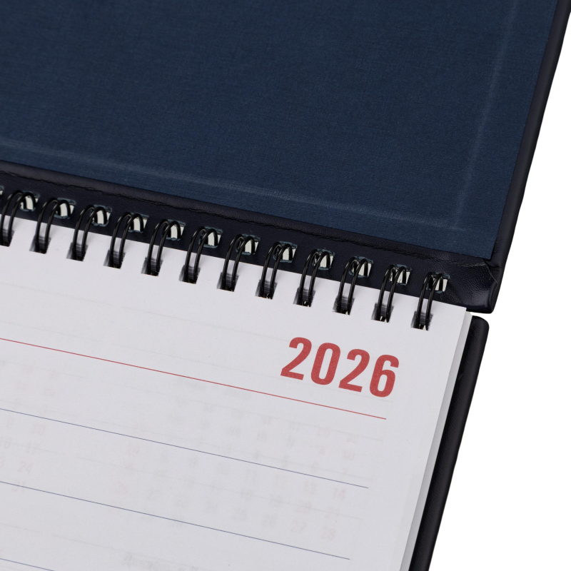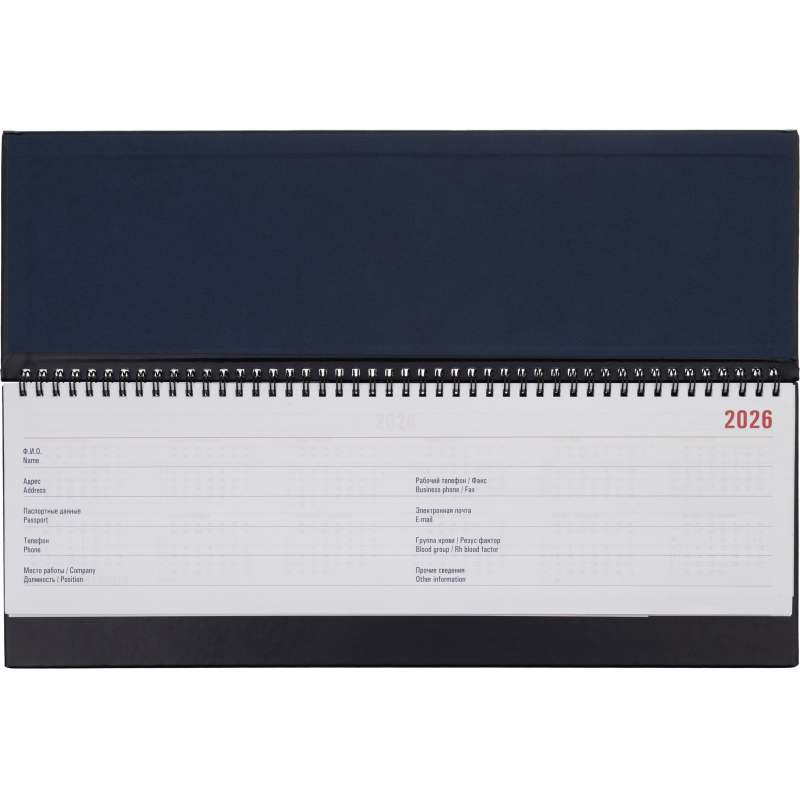 Планинг датированный на 2026 год. Формат: 405×145 мм. Цвет: синий. Блок 110 страниц (55 листов) в 2 краски. Бумага офсетная 70 г/кв.м. Календарь на 2025-2026 г. Вырубка блока по месяцам. Твердая обложка выполнена из искусственной кожи высокого качества. Возможно нанесение логотипа на обложку, любым способом тиснения (блинт или фольга).