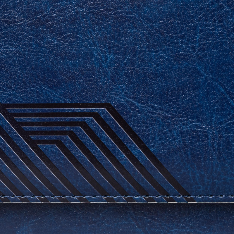 Обложка: твёрдый переплёт с поролоном, блинтовое тиснение, обстрочка по периметру — есть, прямые углы обложки. Внутренний блок: евроспираль открытая, белый офсет 70 г/кв.м, печать в две краски (линия), прямые углы блока, перфорация углов блока — нет, справочный материал — есть. Красочность форзаца: печать пантоном. Индивидуальная упаковка: ПЭТ-пакет.