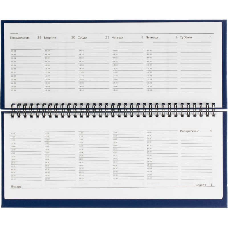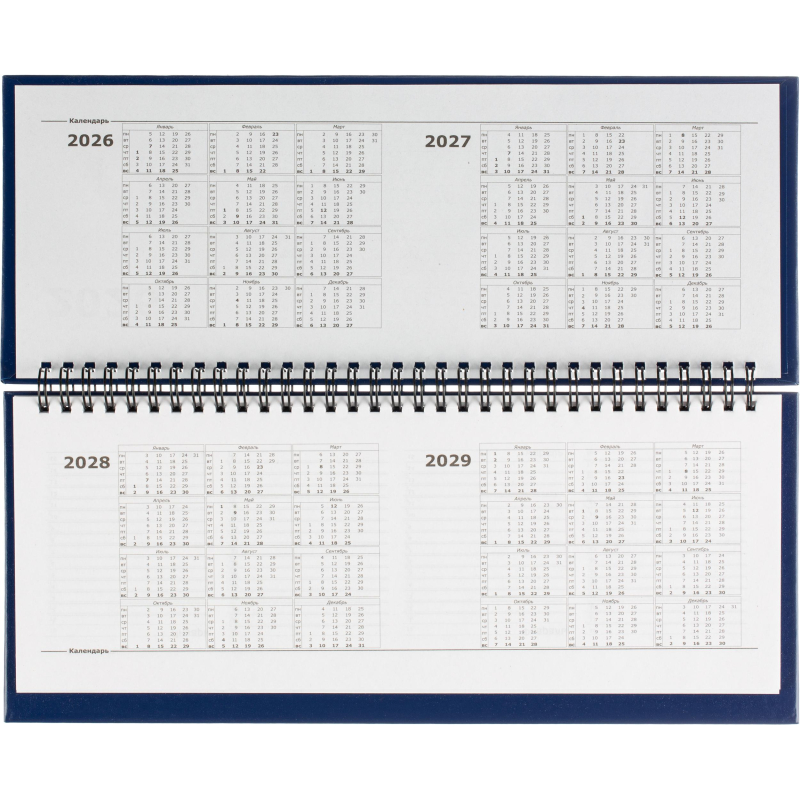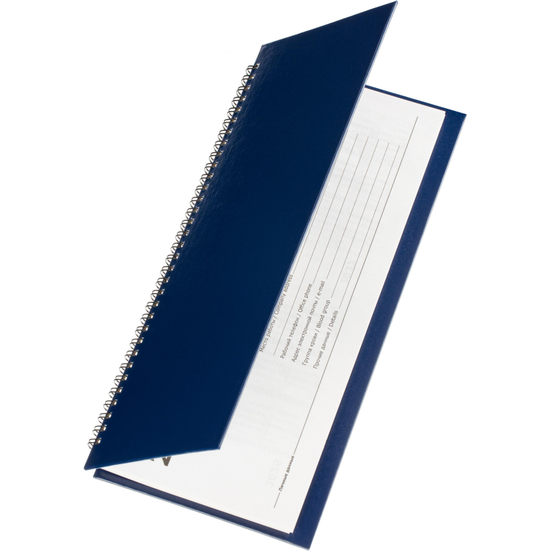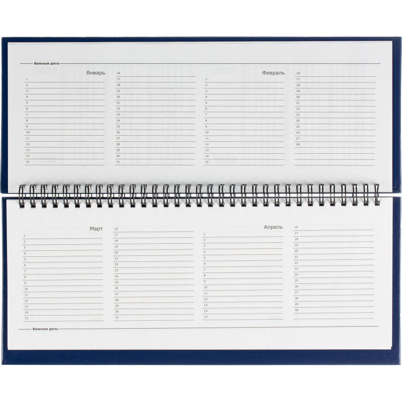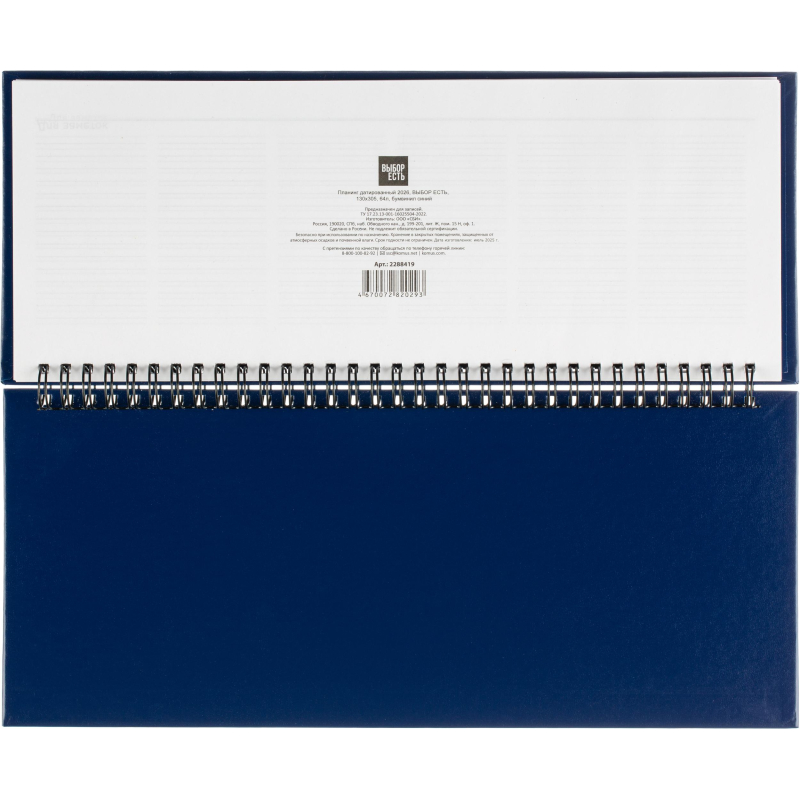Планинг датированный Выбор есть на 2026 год. Размер планинга — 130x305 мм. Обложка твёрдый картон в бумвиниле. Цвет обложки — синий. Стиль обложки универсальный, офисный. Скреплён металлической спиралью.