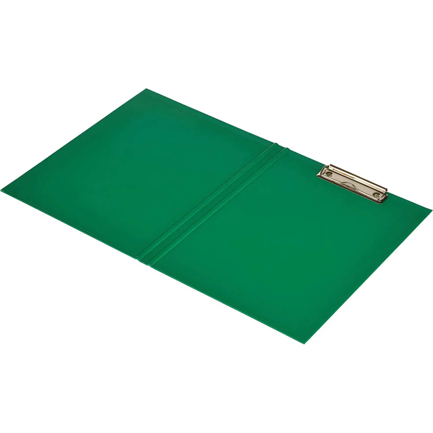 Папка-планшет формата А4 (227.5×314 мм) изготовлена из плотного картона,сверху покрыт бумвинилом зеленого цвета. Позволяет комфортно работать с документами на весу. Металлический прижим надежно удерживает листы и файлы. Вместимость до 100 листов. С крышкой.