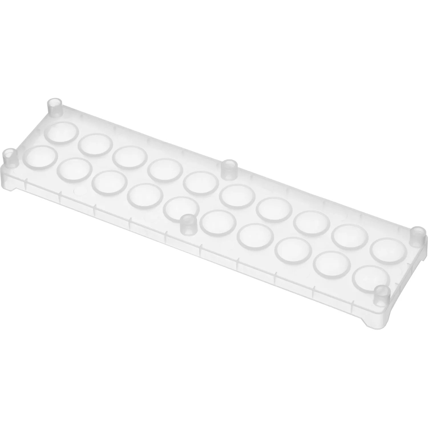 Материал — полипропилен. 20 ячеек. Диаметр гнезда — 18 мм. Габариты (ДxШxВ) — 241×67×12.5 мм.