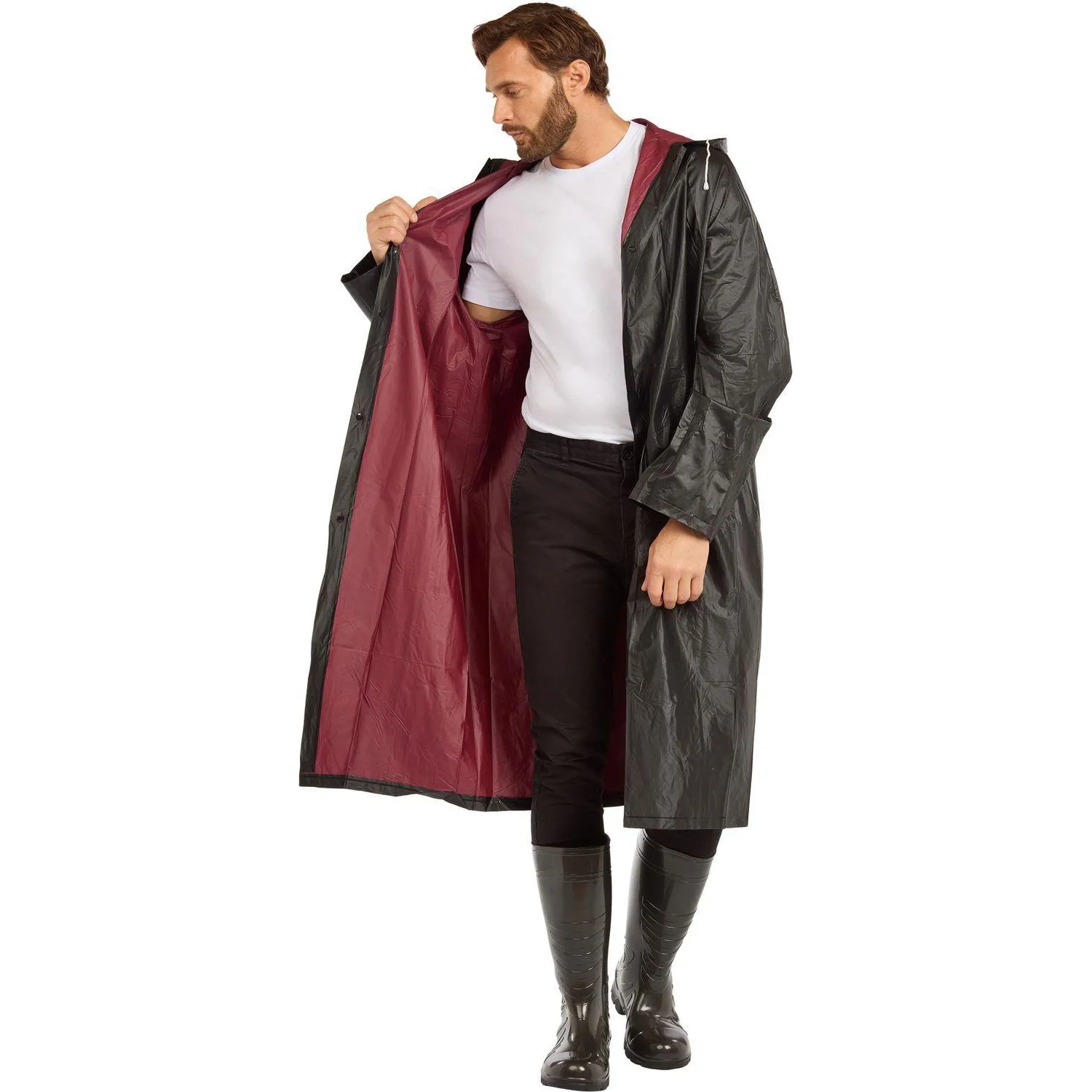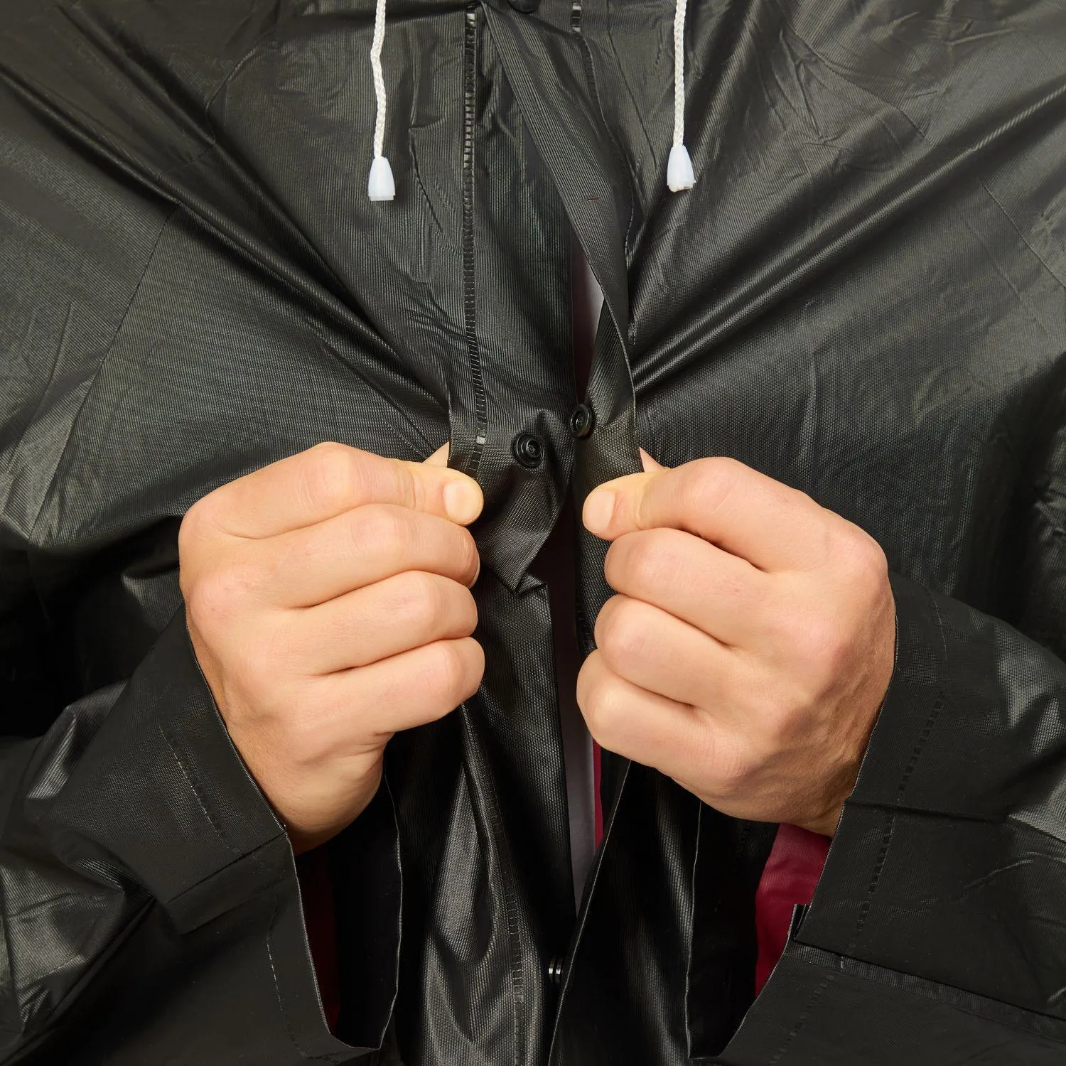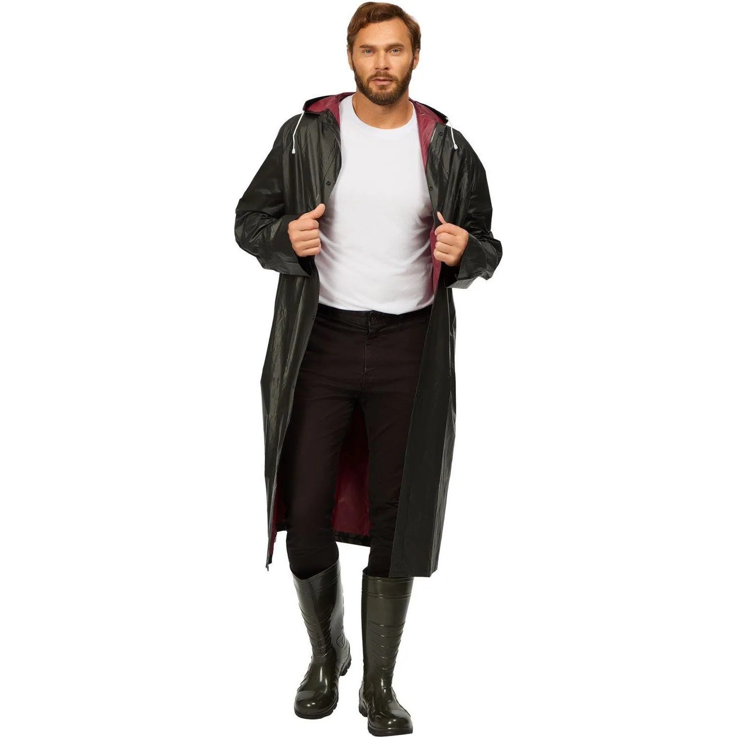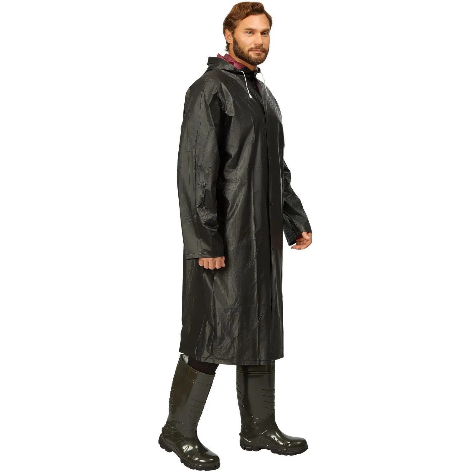 Плащ изготовлен из поливинилхлорида (ПВХ) толщиной 150 мкм. Материал плотный, хорошо тянется, по тактильным ощущениям напоминает тонкую резину. Ткань устойчива к разрывам и намоканию, не требует дополнительной пропитки. Дождевик выполнен в двухслойной конструкции: внешний слой чёрного цвета, внутренний — бордовый, что повышает прочность и долговечность изделия. Длина плаща составляет 120 см при ширине 70 см.