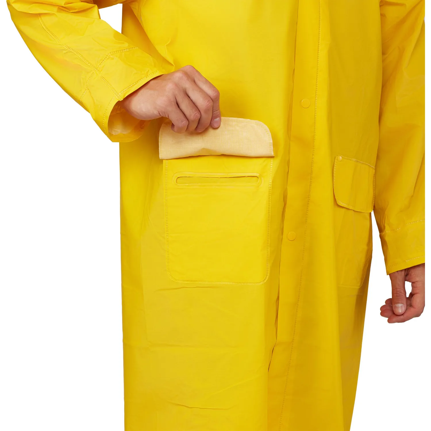 Материал плаща: 100% полиэстер с ПВХ-покрытием, что гарантирует высокую влагозащиту и долговечность. Пропаянные швы обеспечивают дополнительную защиту от воды. В комплект входит втачной капюшон, который можно регулировать по мере необходимости. Ветрозащитная планка на кнопках предотвращает попадание ветра внутрь, а рукава-реглан обеспечивают свободное движение.
