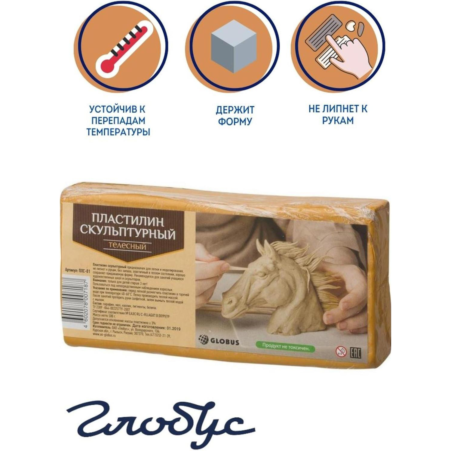 Скульптурный пластилин «Глобус» сохраняет пластичность и плотность в процессе работы. Поэтому такой пластилин находит применение главным образом в работах, где требуется очень тонкая и чёткая проработка формы. Сохраняя все достоинства традиционного пластилина, он идеально держит форму, что позволяет создавать из него небольшие предметы. Устойчив к температурным изменениям. Для изготовления скульптурного пластилина используется воскообразная масса с добавлением минеральных пигментов и наполнителей, вес куска — 500 г. Пластилин имеет телесный цвет.