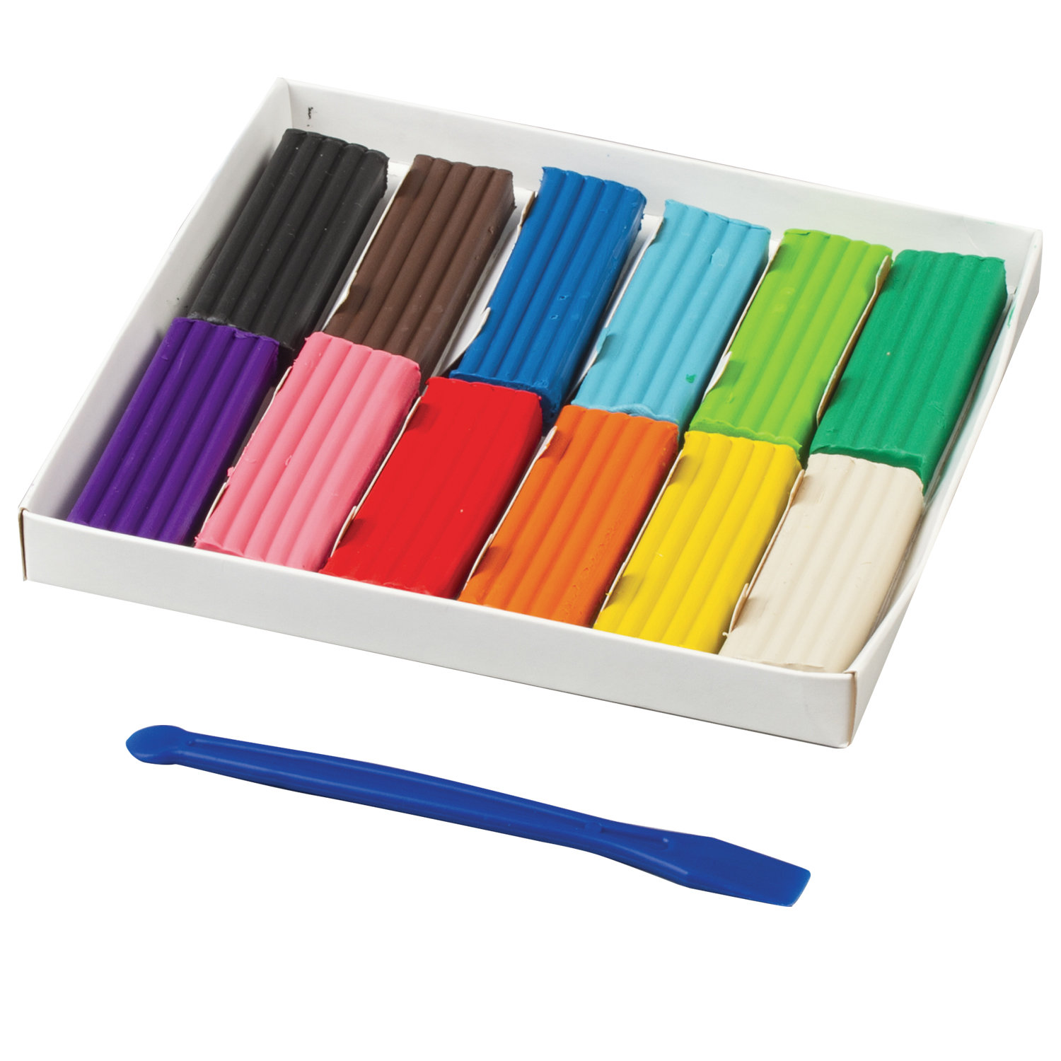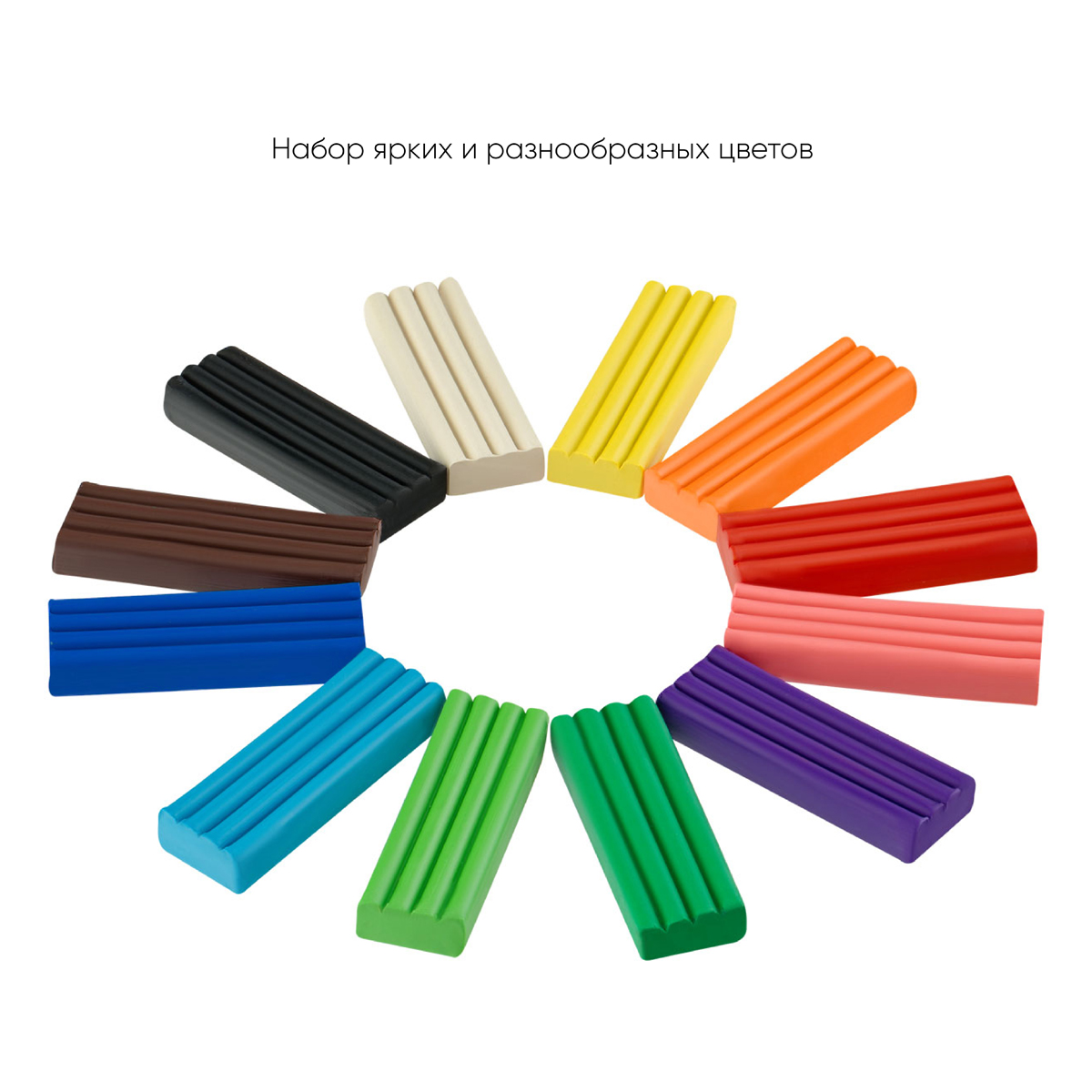 Набор включает 12 классических цветов: черный, коричневый, синий, голубой, зеленый, салатовый, фиолетовый, розовый, алый, оранжевый, желтый, белый. В комплекте идет пластиковая стека для моделирования.