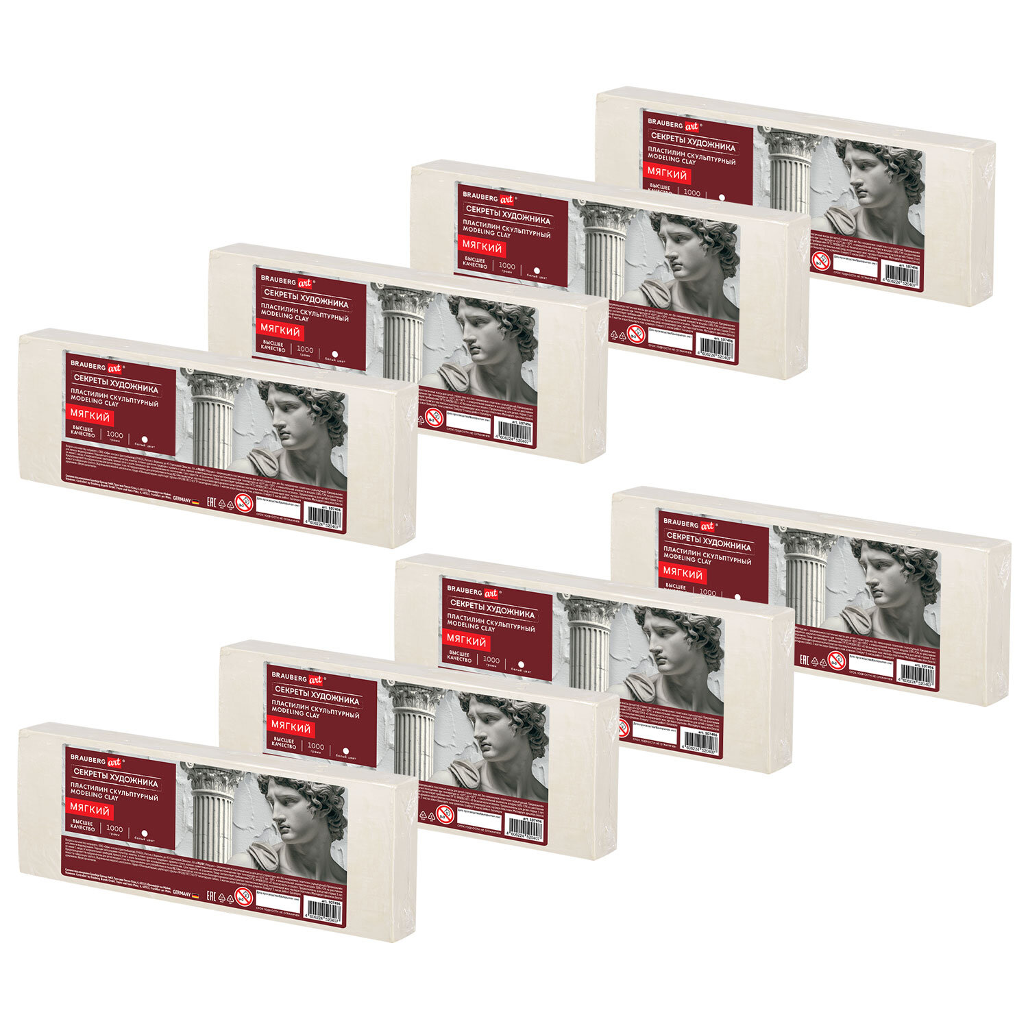 Набор из 8 брусков по 1 кг пластилина, цвет белый. Отлично держит форму и устойчив к перепадам температуры. Не оставляет пятен, не липнет к рукам. Мягкий скульптурный пластилин более удобен в работе и подойдет даже любителям. Оптимальное для работы скульпторов соотношение мягкости и твердости материала, хорошая пластичность, естественные цвета. Каждый брусок весом 1 кг упакован в термоусадочную пленку и далее бруски упакованы в гофрированную коробку.