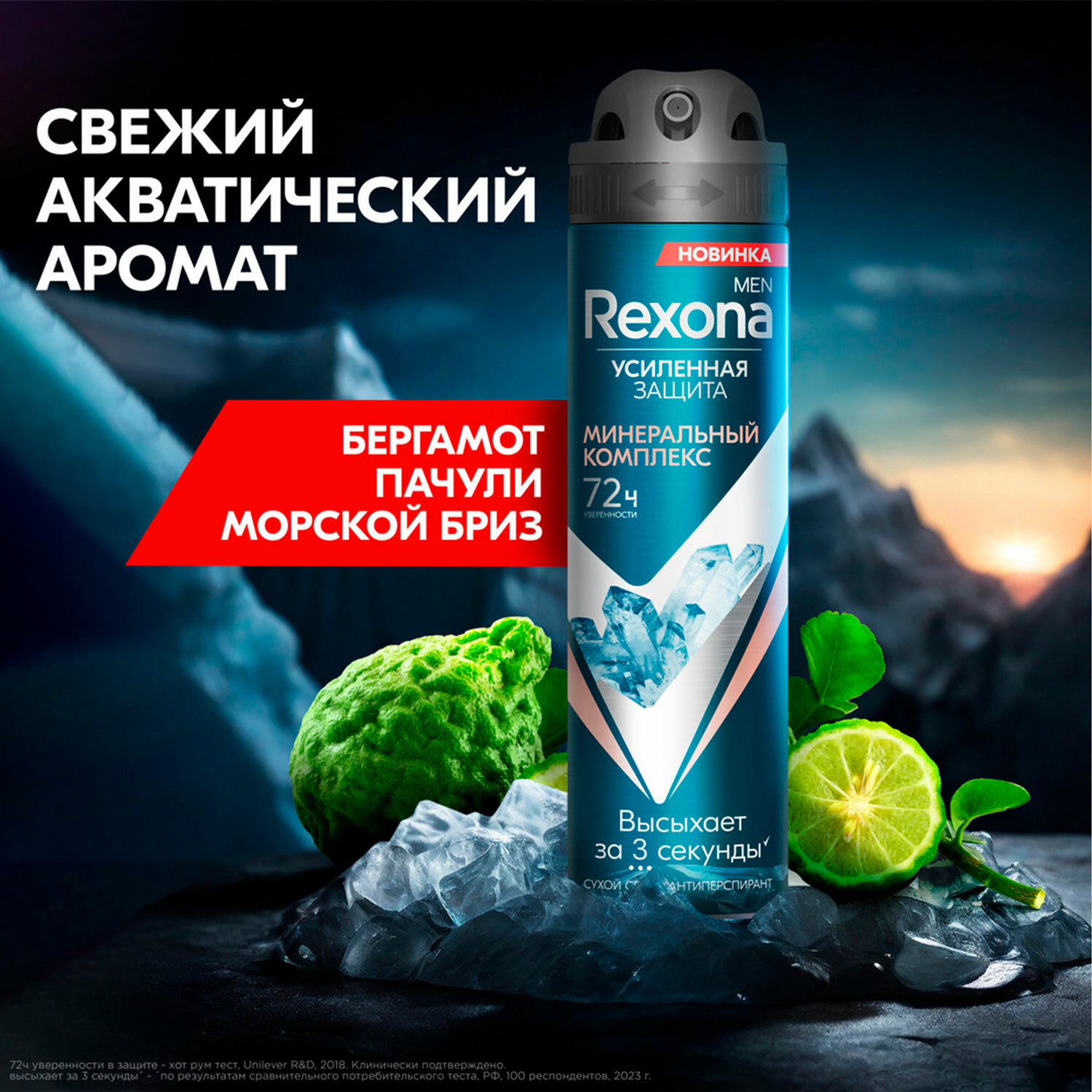 Сразу после освежающего душа воспользуйтесь новинкой сухим спреем-антиперспирантом REXONA "Минеральный комплекс". Улучшенная формула высыхает за 3 секунды и оставляет приятное ощущение на коже. Без липкости, без следов. Антиперспирант разработан на основе формулы усиленной эффективности: создает дышащий микробарьер для непревзойденной защиты от пота и запаха на 72 часа*. Технология Motionsense активируется при движении, сохраняя свежесть на весь день. Свежий цитрусовый аромат с акватическими нотами садится близко к телу и не перебивает аромат вашего парфюма.