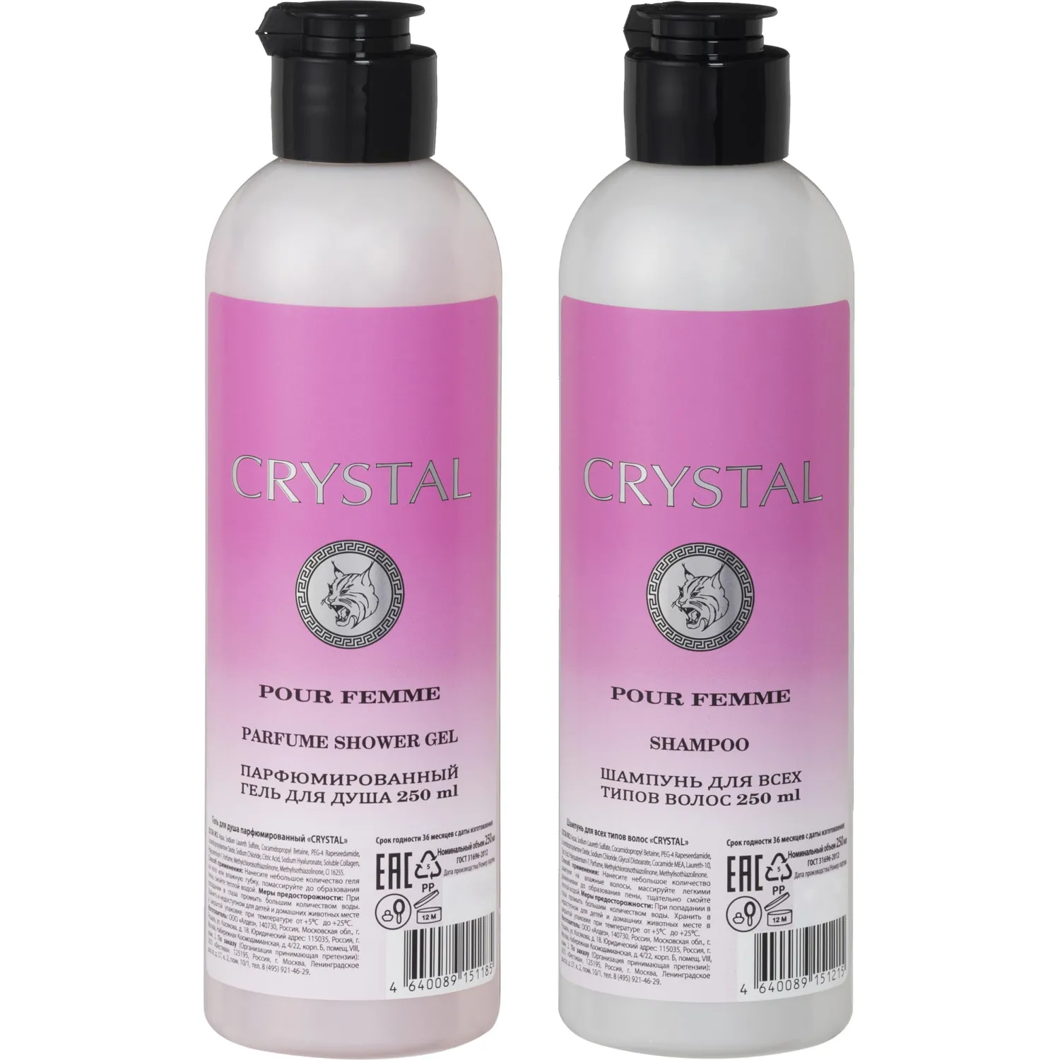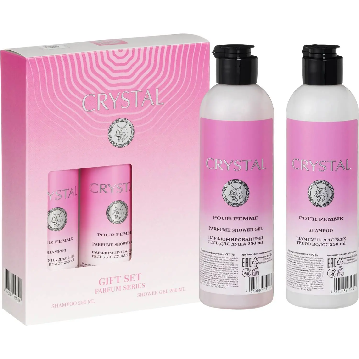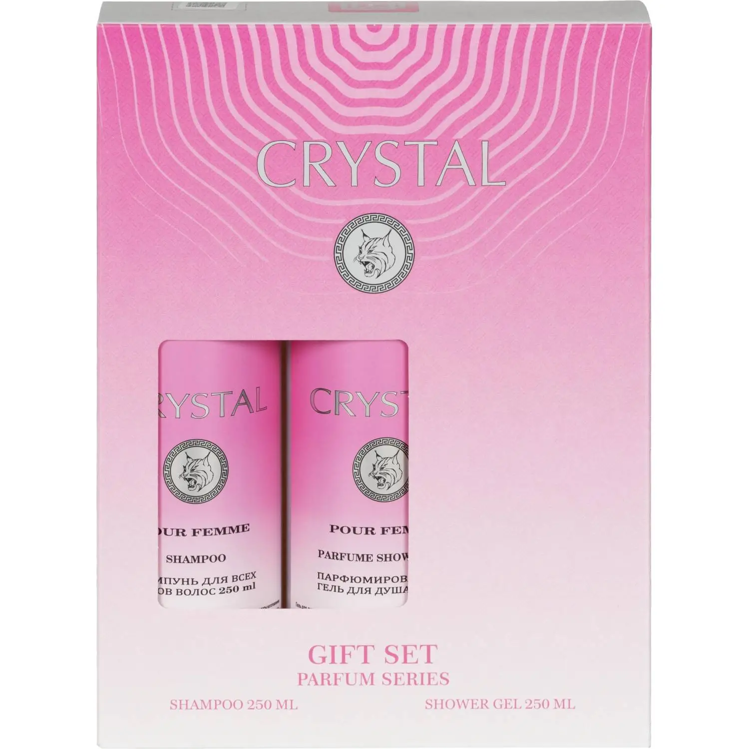 В набор входят шампунь 250 мл и гель для душа 250 мл, оформленные в яркую подарочную коробку.