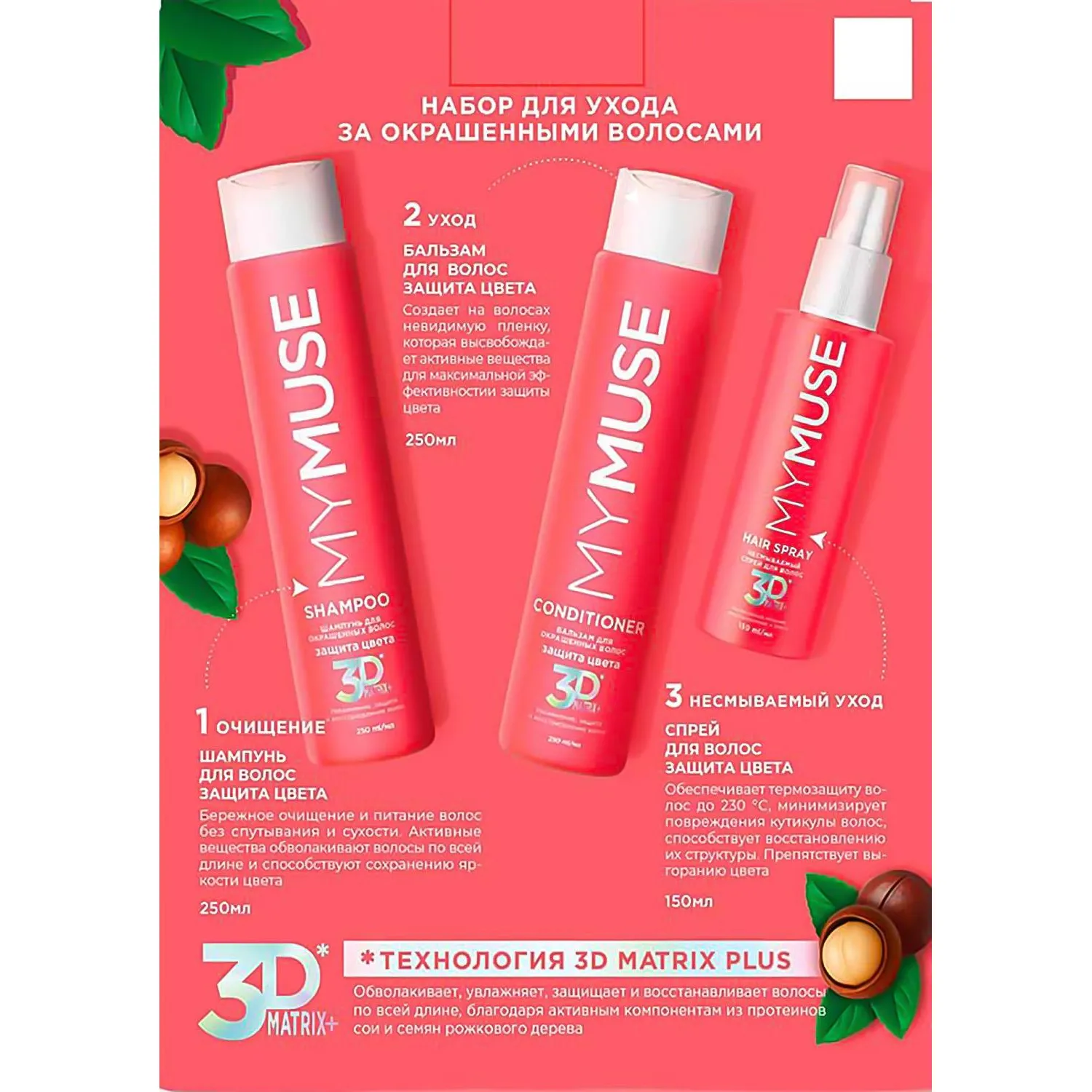 Подарочный набор косметики от MyMuse включает три средства для ухода за волосами. Он специально разработан для защиты цвета и восстановления структуры волос. Этот набор станет отличным подарком для себя или для близких.