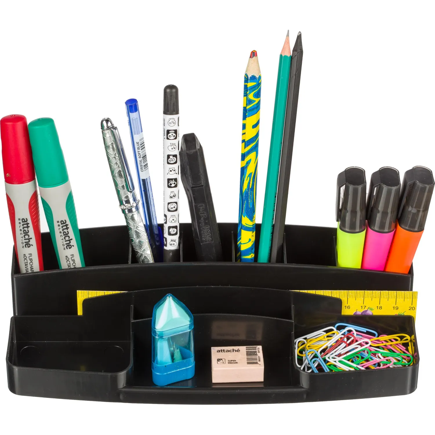 Подставка для канцелярских мелочей Attache хорошо подойдёт для рабочего стола и не займёт много места. Все необходимые канцелярские принадлежности всегда будут под рукой. Подставка Attache предназначена для хранения канцелярских мелочей. Имеет 10 отделений. Выполнена из пластика чёрного цвета. Размер: 95×250×60 мм. Может быть установлен на лоток горизонтальный для бумаг, артикул 877401.