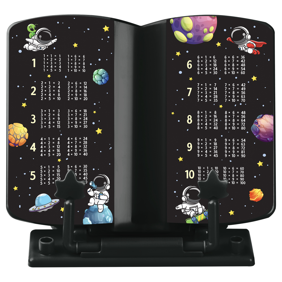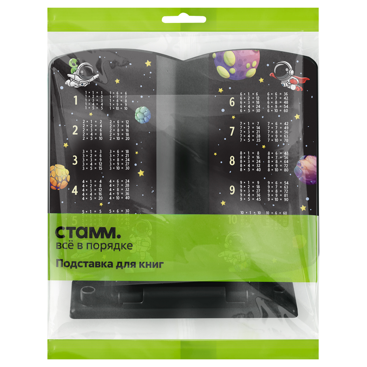 Подставка для книг «СТАММ» серии «Космонавты» – школьный аксессуар, повышающий комфорт при чтении. Изделие размером 200*200*25 мм подходит для больших и малых форматов книг. Подставка изготовлена из качественного пластика. Благодаря наличию фиксатора подставка не складывается под тяжестью книги. Изделие имеет регулируемый угол наклона – от 110 до 135 градусов. Складная конструкция удобна при транспортировке и хранении. Использование подставки поможет сформировать правильную осанку. Цвет изделия – чёрный. Дизайн с космонавтами точно понравится школьникам. Его дополняет таблица умножения. Индивидуальная упаковка – флоупак.