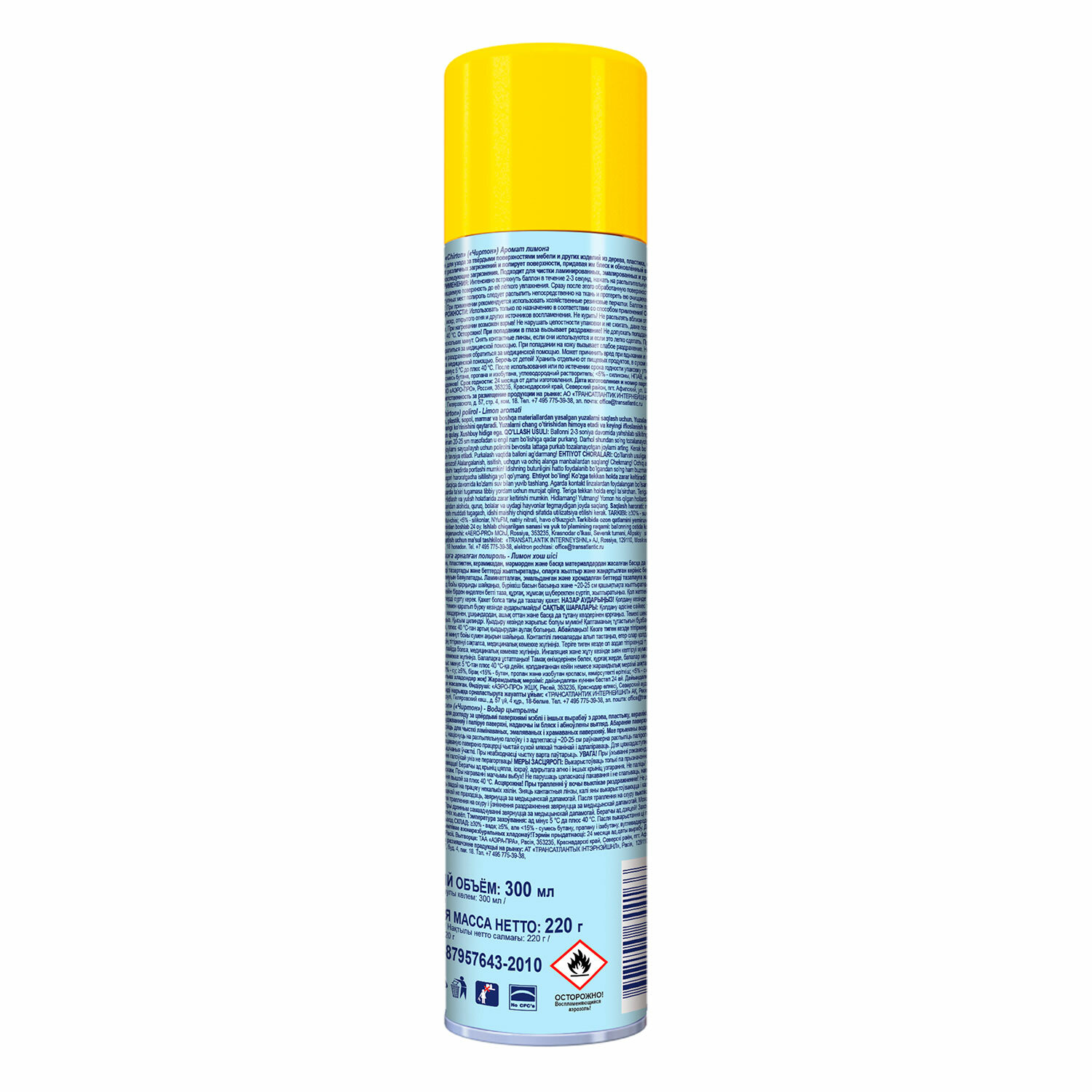 Меры предосторожности: Использовать только по назначению! Избегать попадания в глаза! При попадании в глаза промыть большим количеством воды! При необходимости обратиться к врачу! Баллон находится под высоким давлением! Не протыкать и не сжигать баллон даже после использования! Чрезвычайно огнеопасно! Не курить во время использования! Не распылять вблизи открытого огня и раскаленных предметов! Избегать вдыхания высокой концентрации аэрозоля! Хранить отдельно от пищевых продуктов в недоступном для детей месте! Не разбирать и не давать детям!