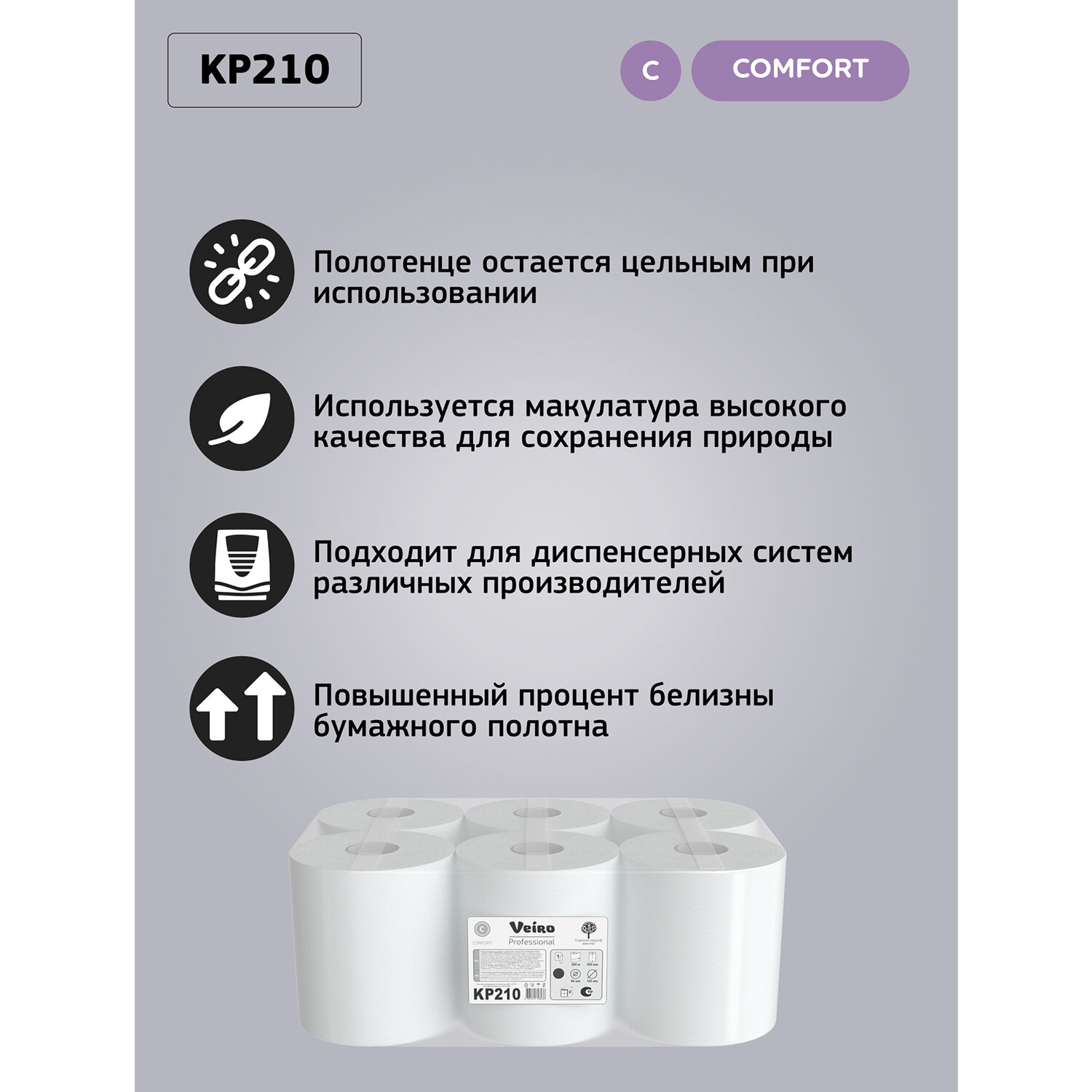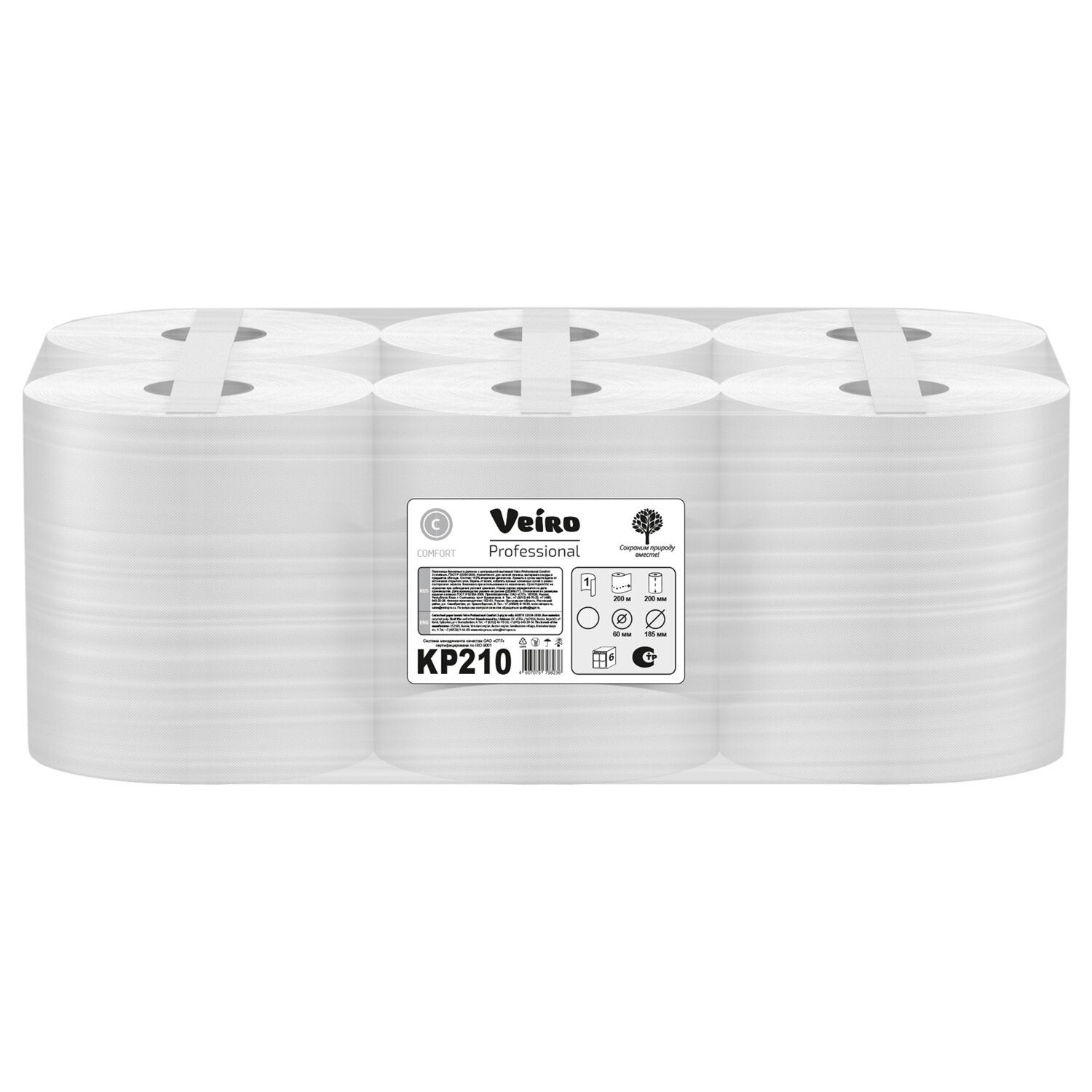 Полотенца бумажные с центральной вытяжкой 200 м, VEIRO (Система M2) COMFORT, 1-слойные, белые, КОМПЛЕКТ 6 рулонов, KP210, КР210