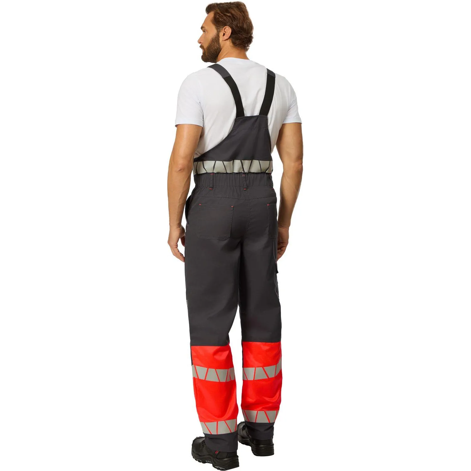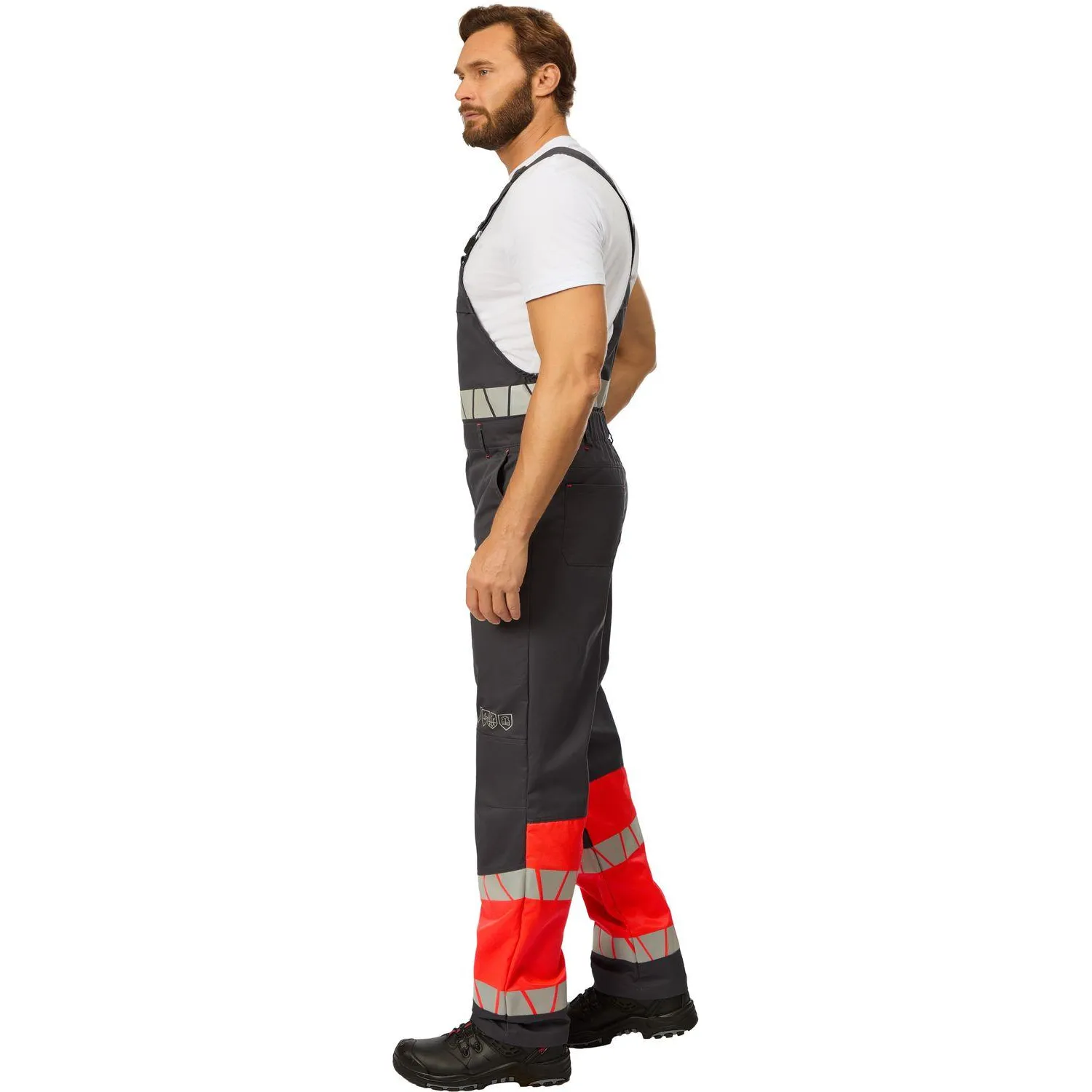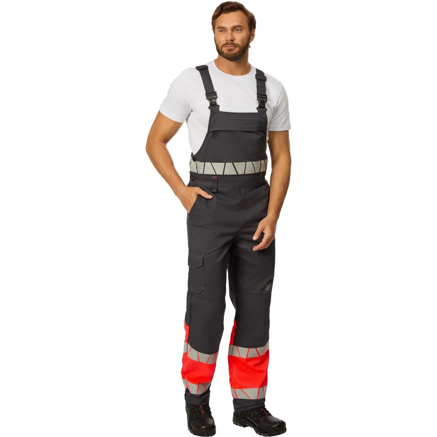 Светоотражающие элементы: термопринт шириной 50 мм, 350-400 кнд на нижних частях брюк, на нагруднике и спинке.